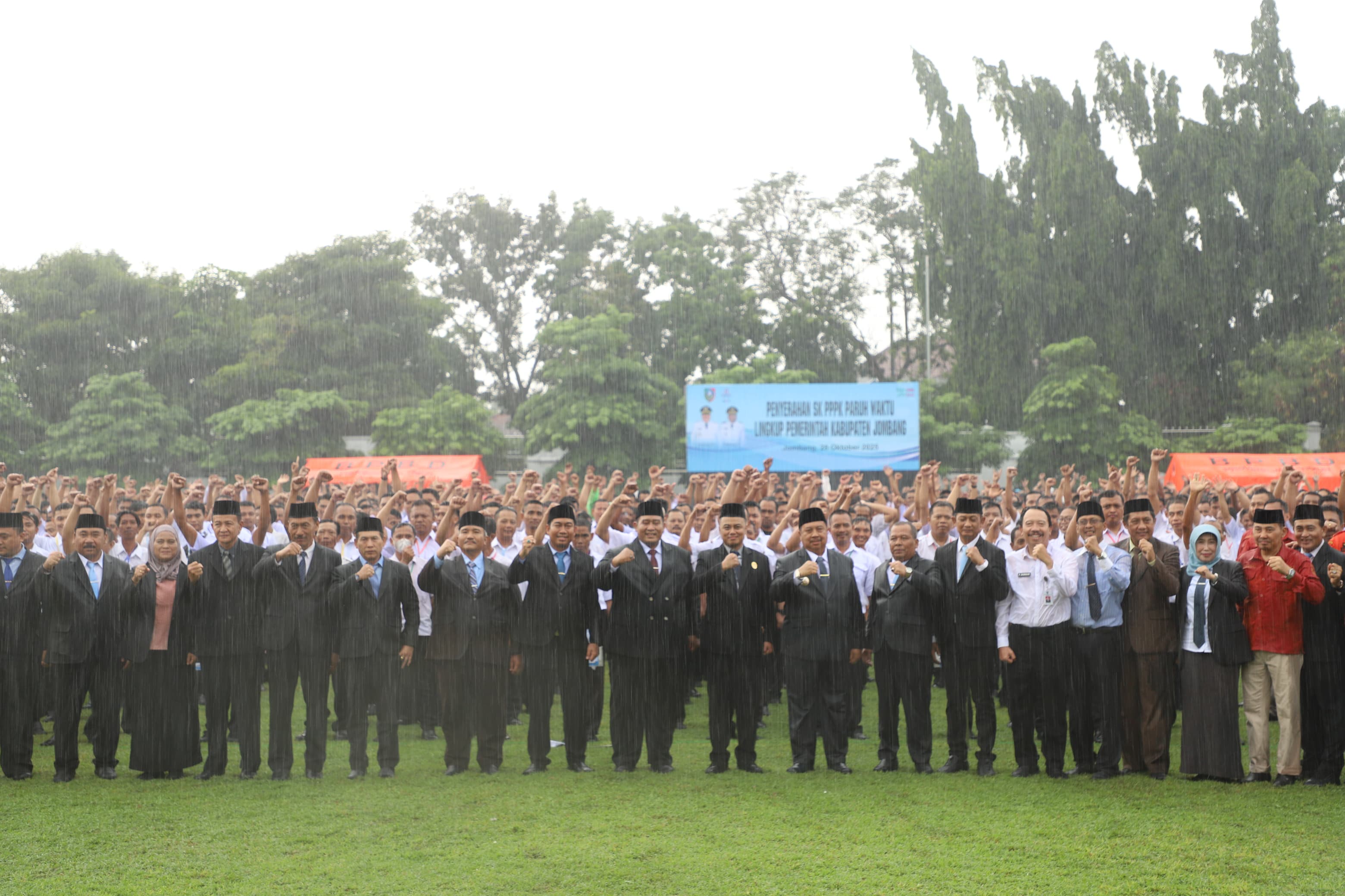 JOMBANGKAB – Ribuan wajah haru tak lagi memikirkan dinginnya guyuran hujan deras pada Selasa (28/10) siang di Lapangan Pemkab Jombang. Sebanyak 4.101 pegawai non-ASN akhirnya menuntaskan penantian panjang mereka, resmi menerima Surat Keputusan (SK) pengangkatan sebagai Pegawai Pemerintah dengan Perjanjian Kerja (PPPK) Paruh Waktu.