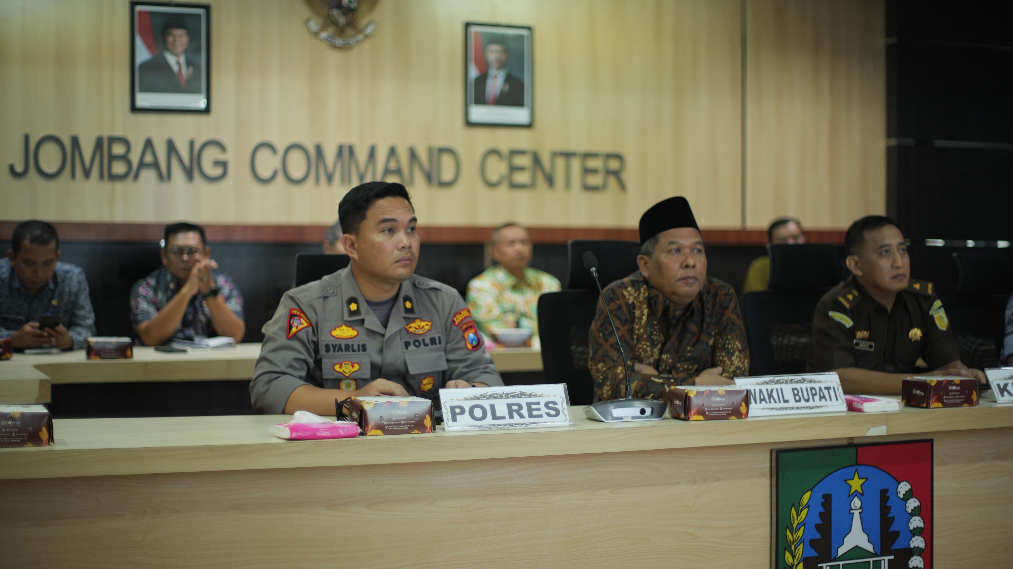 Wakil Bupati Jombang, Salmanudin, bersama perwakilan Forkopimda dan para Kepala OPD terkait lingkup Pemkab Jombang, mengikuti Rakornas dari ruang Jombang Command Center (JCC). Rakornas tersebut secara umum membahas langkah strategis pemerintah daerah dalam menghadapi potensi bencana, pengendalian inflasi, serta persiapan jelang Nataru.