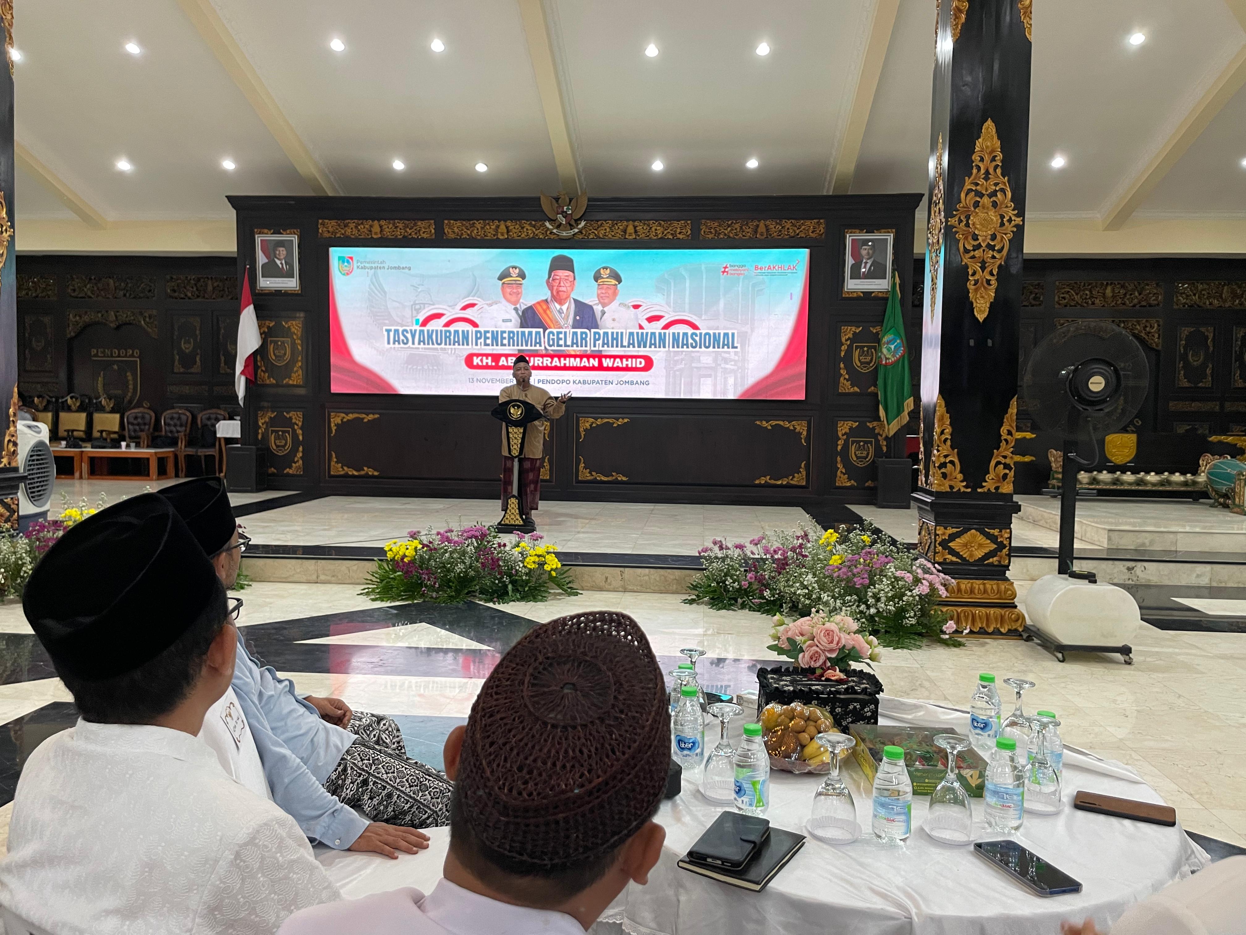 JOMBANGKAB – Suasana khidmat, haru dan bangga menyelimuti Pendopo Kabupaten Jombang pada Kamis (13/11/2025) malam, dalam acara Tasyakuran Penganugerahan Gelar Pahlawan Nasional kepada mendiang Presiden ke-4 RI, KH. Abdurrahman Wahid (Gus Dur). Acara tersebut dihadiri oleh Bupati Jombang Warsubi, Forkopimda, Sekretaris Daerah Kabupaten Jombang beserta jajaran Kepala OPD, alim ulama, tokoh agama, pimpinan pondok pesantren, dan tokoh masyarakat.