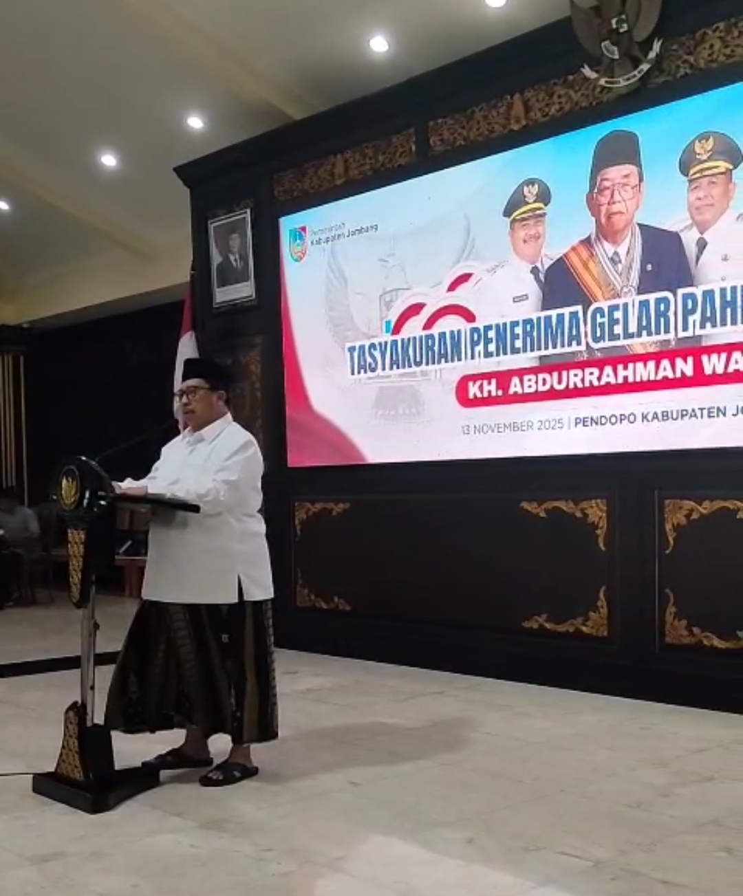 Bupati Jombang, Warsubi S.H., M.Si., dalam sambutannya menyampaikan rasa syukur yang mendalam atas pengakuan negara terhadap jasa-jasa almarhum Gus Dur. "Syukur alhamdulillah kita panjatkan kehadirat Allah SWT," ujar Bupati Warsubi mengawali sambutannya.