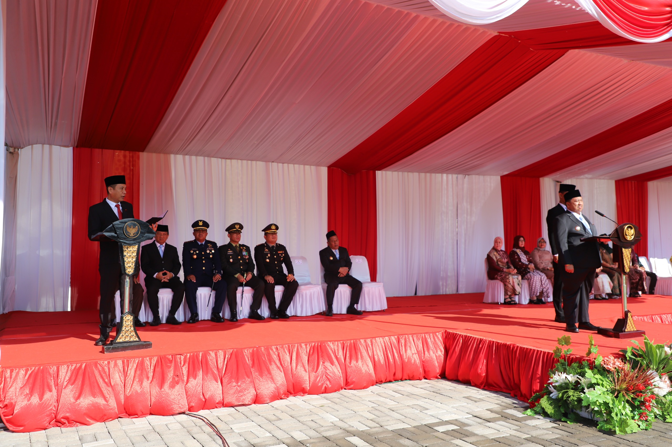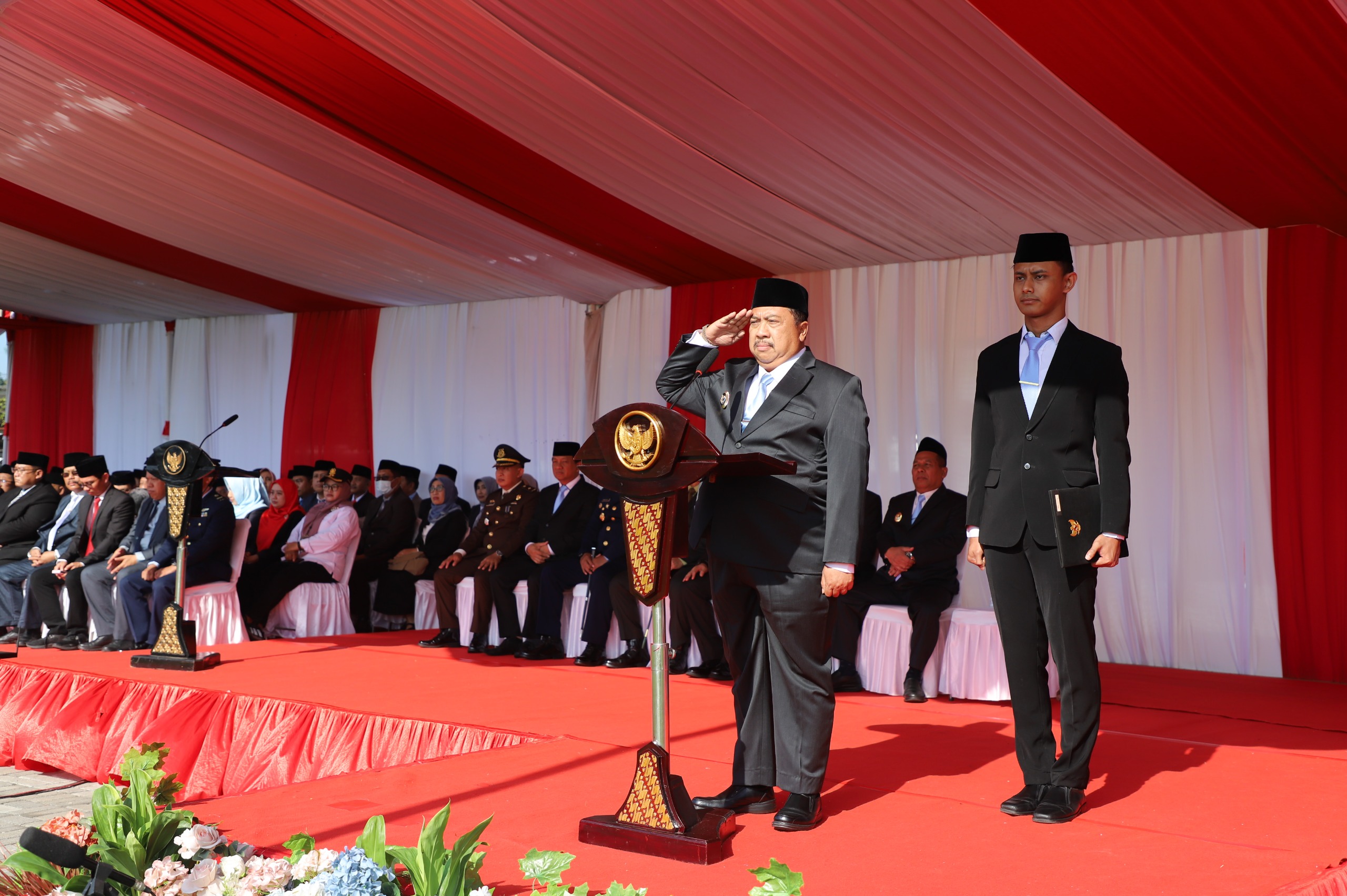 Bupati Jombang, Warsubi, S.H., M.Si., bertindak sebagai Inspektur Upacara. Dengan suara lantang dan penuh wibawa, beliau membacakan teks Pancasila yang serentak diikuti seluruh peserta. Momen ini menjadi penegasan bahwa Pancasila tetap hidup dalam denyut nadi masyarakat, menjadi dasar negara sekaligus perekat bangsa.