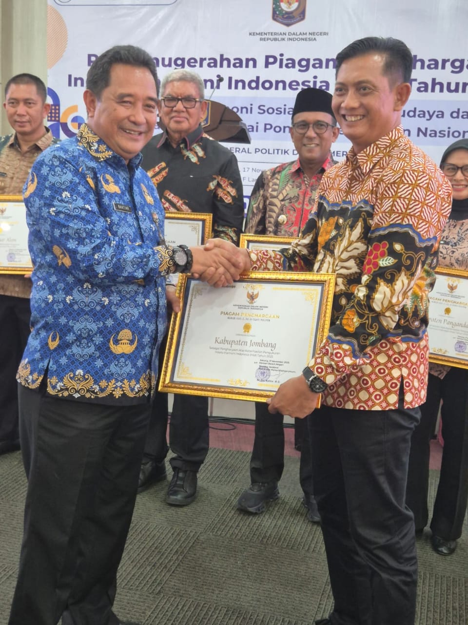 Bakesbangpol Kabupaten Jombang Menerima Penghargaan Atas Keberhasilan Pengukuran Indeks Harmoni Indonesia (IHaI) Tahun 2025 Oleh Kementerian Dalam Negeri Republik Indonesia