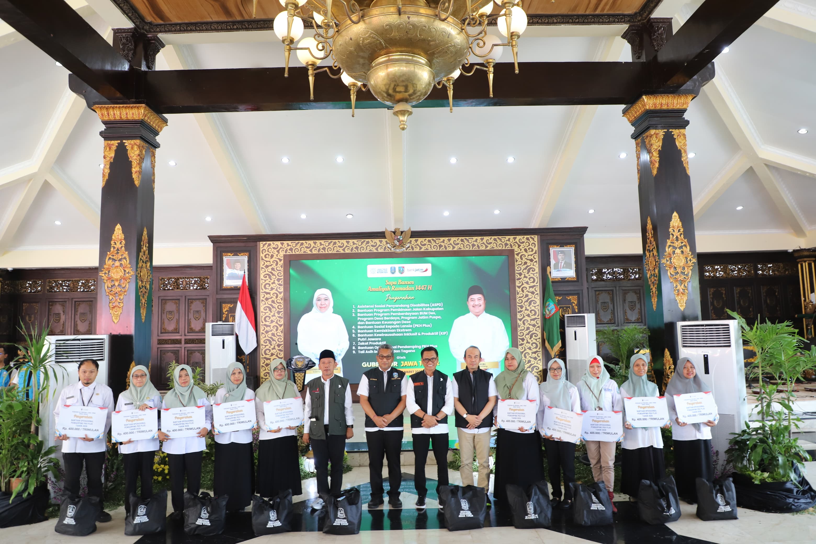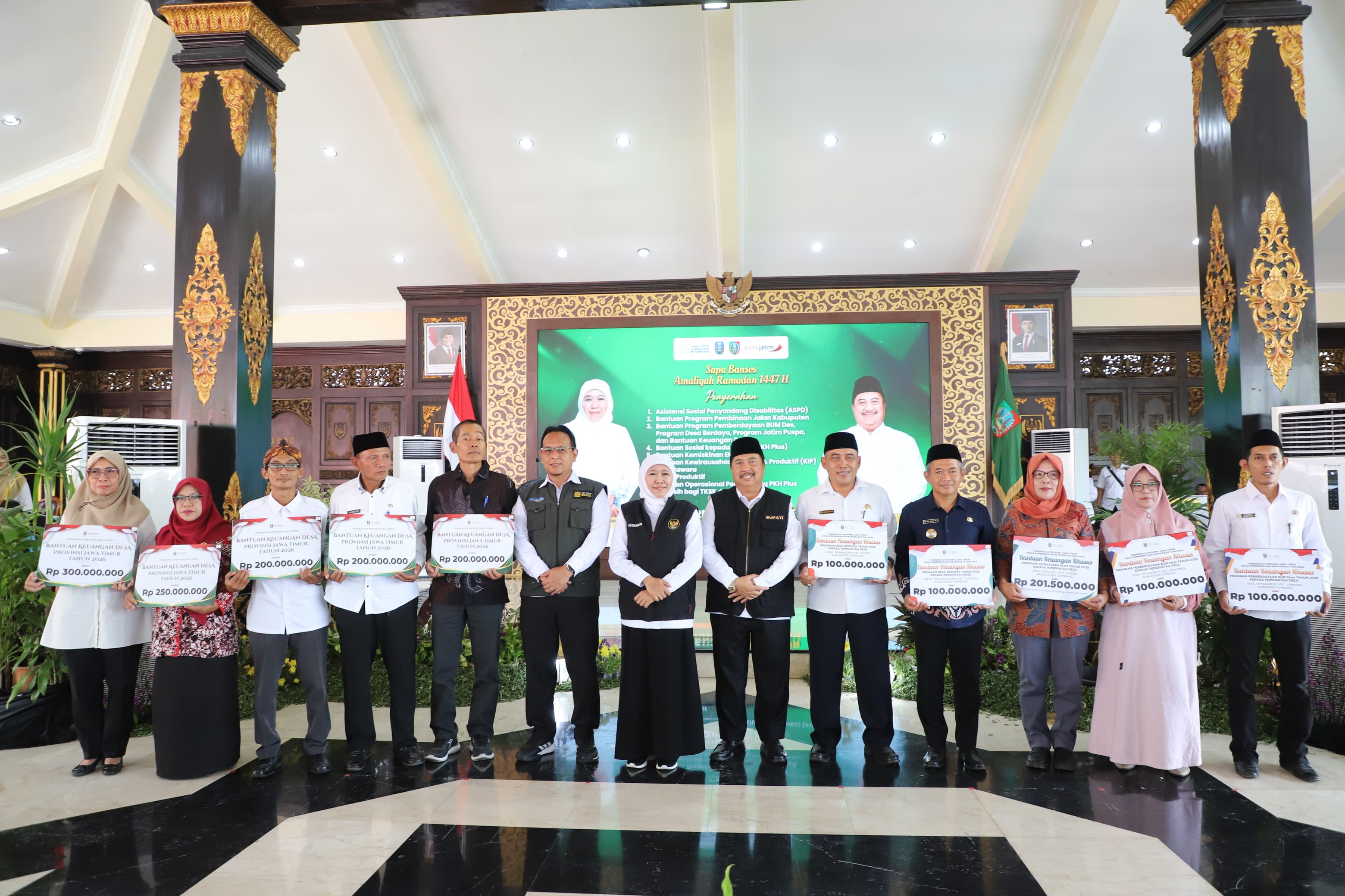 Rangkaian kegiatan dimulai pukul 13.00 WIB di Pendopo Kabupaten Jombang melalui acara "Sapa Bansos" Amaliyah Ramadan 1447 H. Dalam kesempatan ini, Gubernur Khofifah didampingi Bupati Jombang Warsubi, S.H., M.Si, Kepala Dinsos Prov. Jatim Dra. Restu Novi Widiani, MM juga Forkopimda Kabupaten Jombang serta para Kepala OPD Provinsi Jawa Timur yang hadir menyerahkan berbagai bantuan sosial secara simbolis kepada ratusan penerima manfaat.