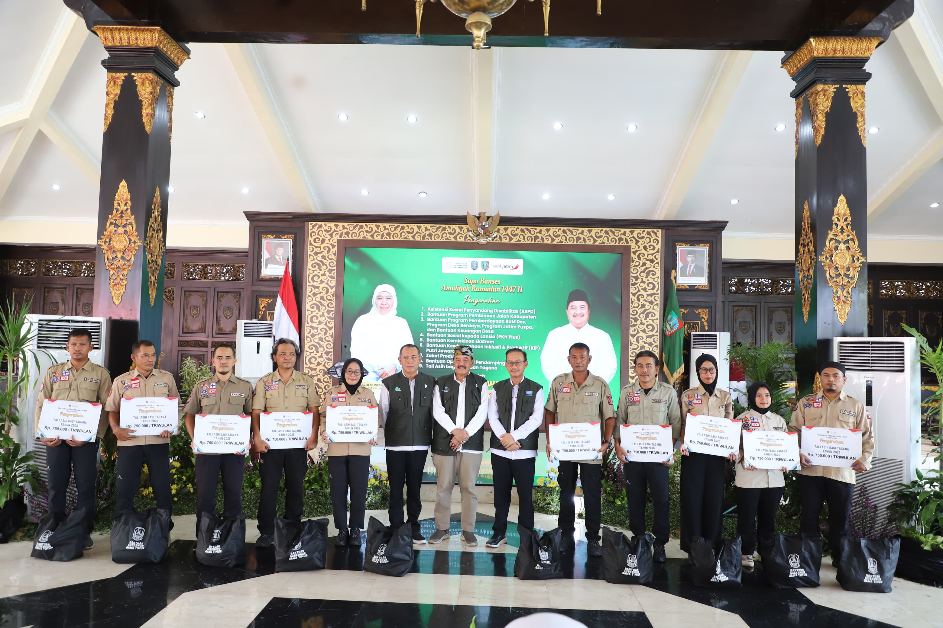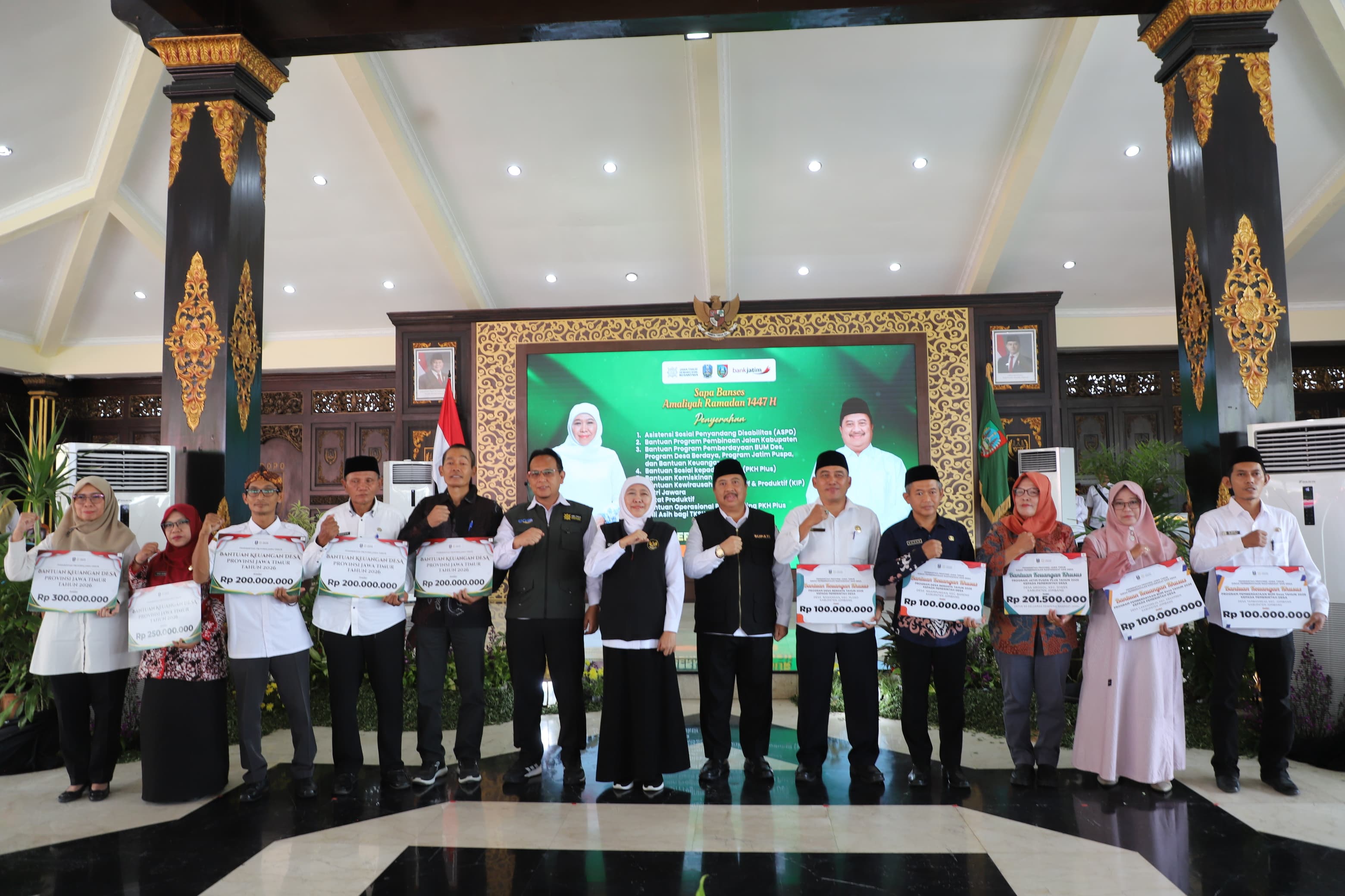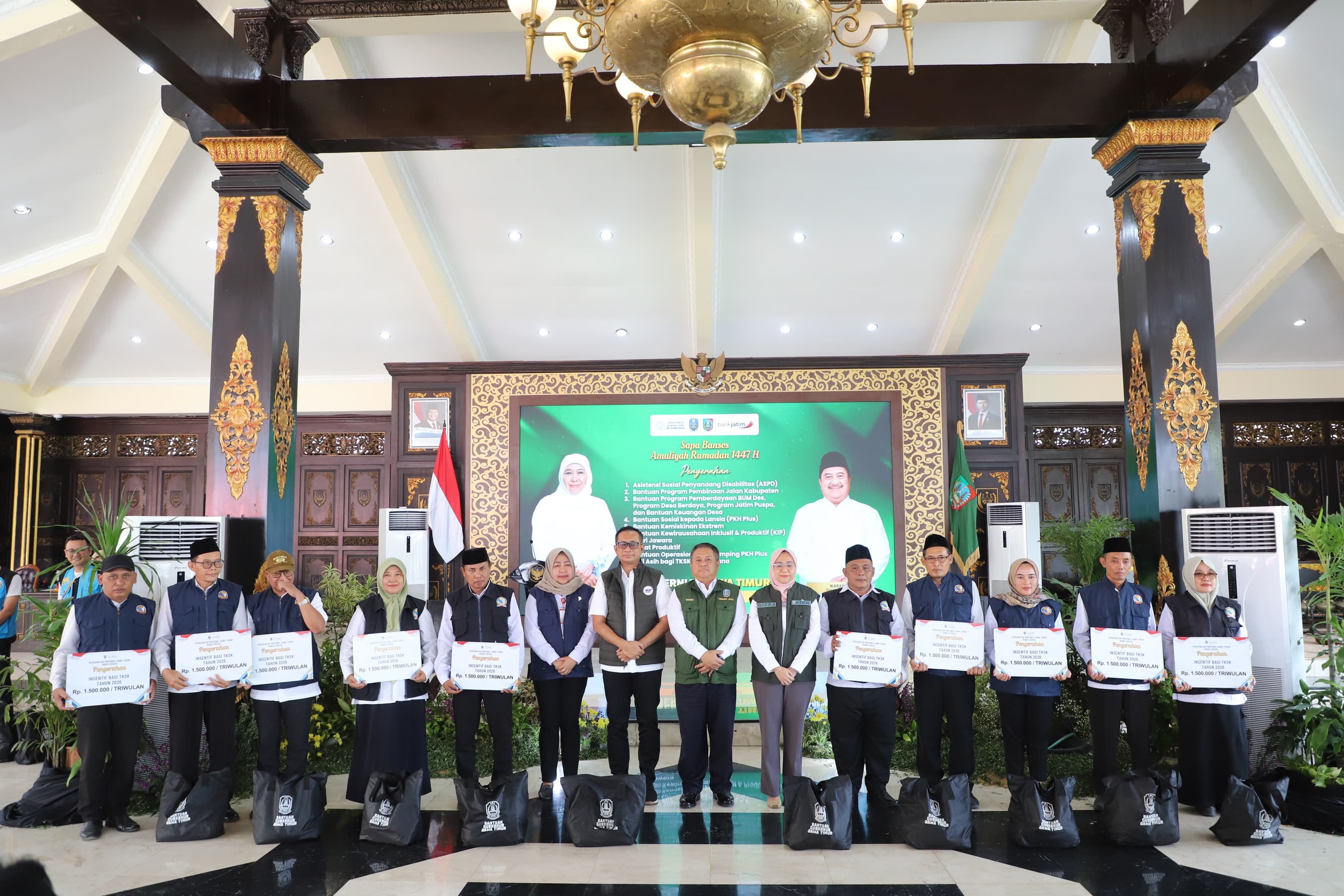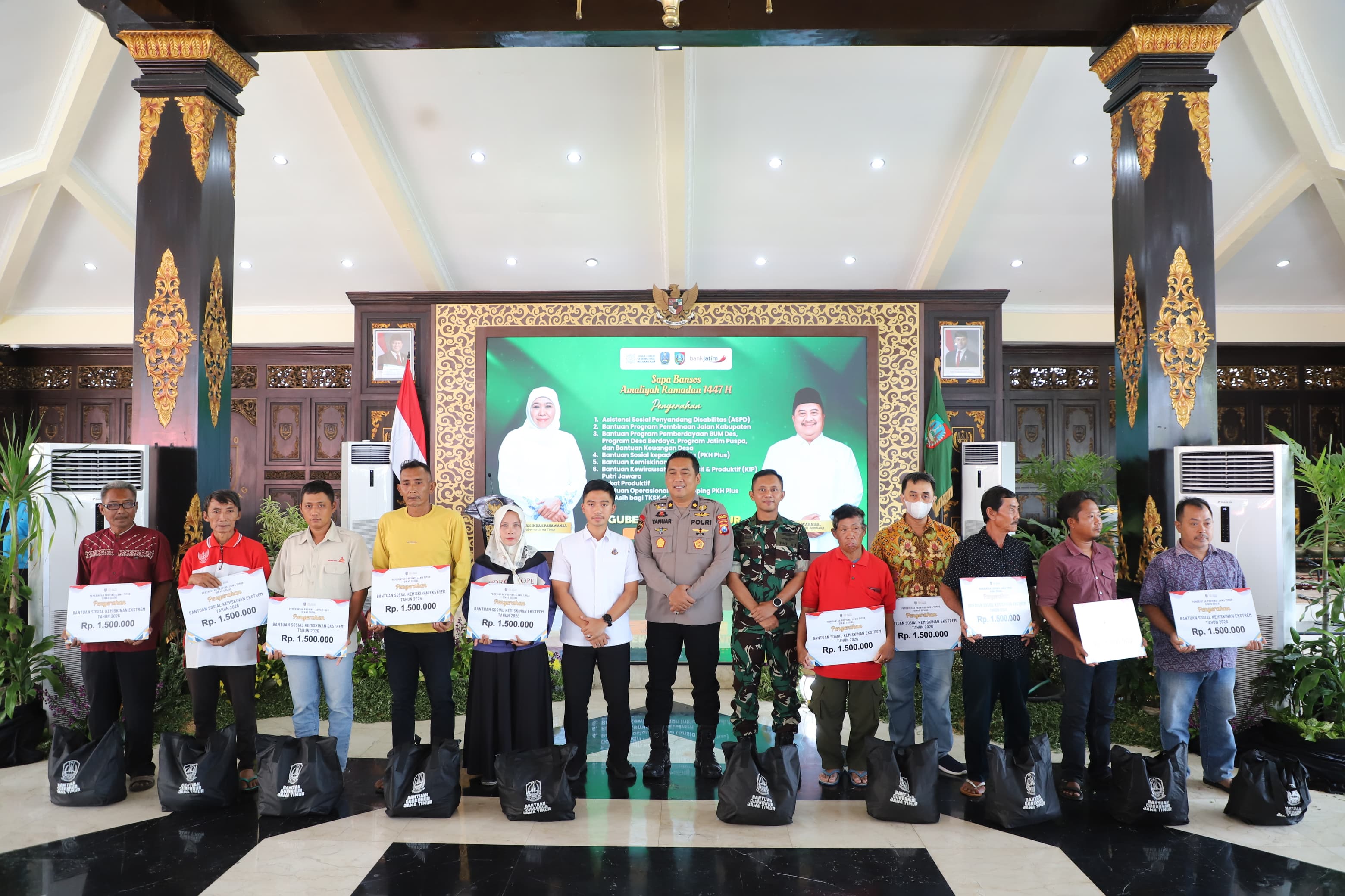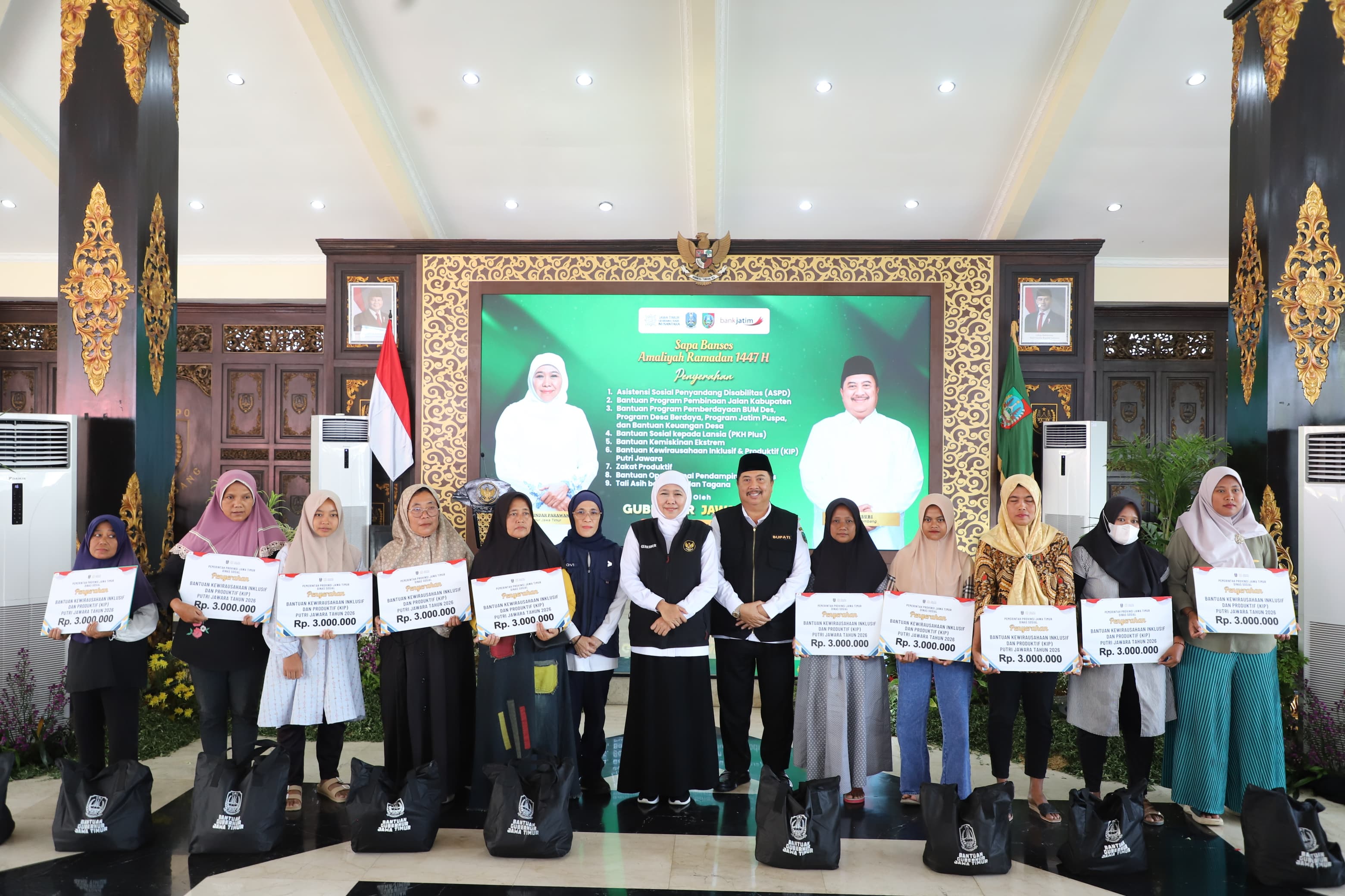"Atas nama pribadi dan Pemerintah Kabupaten Jombang, kami menyampaikan apresiasi dan terima kasih yang sebesar-besarnya atas perhatian Pemerintah Provinsi Jawa Timur. Bantuan melalui program 'Sapa Bansos' ini adalah ikhtiar bersama dalam mempercepat penanggulangan kemiskinan dan mengurangi ketimpangan sosial. Terlebih menjelang Idul Fitri, intervensi ini diharapkan memperkuat daya tahan ekonomi masyarakat sehingga warga dapat beribadah dengan lebih tenang dan khusyuk," tutur Bupati Jombang Warsubi dalam sambutannya.