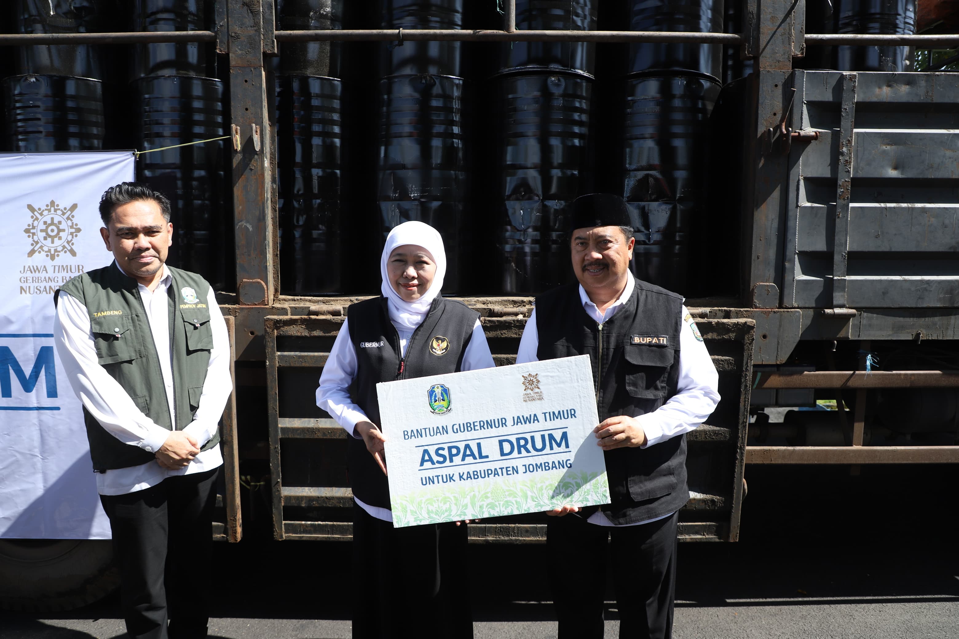 Selain bantuan sosial, Pemprov Jatim memberikan dukungan konkret bagi perbaikan infrastruktur di Jombang. Gubernur Khofifah secara simbolis menyerahkan bantuan 300 drum aspal kepada Pemerintah Kabupaten Jombang untuk percepatan perbaikan jalan kabupaten.