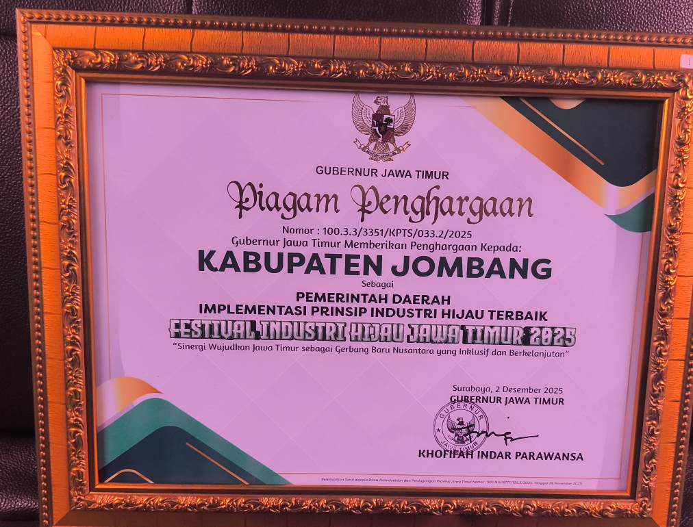 JOMBANGKAB – Kabupaten Jombang kembali mencatat prestasi membanggakan di tingkat provinsi. Pada gelaran Festival Industri Hijau Jawa Timur 2025 yang mengusung tema "Sinergi Wujudkan Jawa Timur sebagai Gerbang Baru Nusantara yang Inklusif dan Berkelanjutan" di Dyandra Convention Center Surabaya, Selasa (2/12/2025). Jombang dinobatkan sebagai Pemerintah Daerah Implementasi Prinsip Industri Hijau Terbaik se-Jawa Timur.