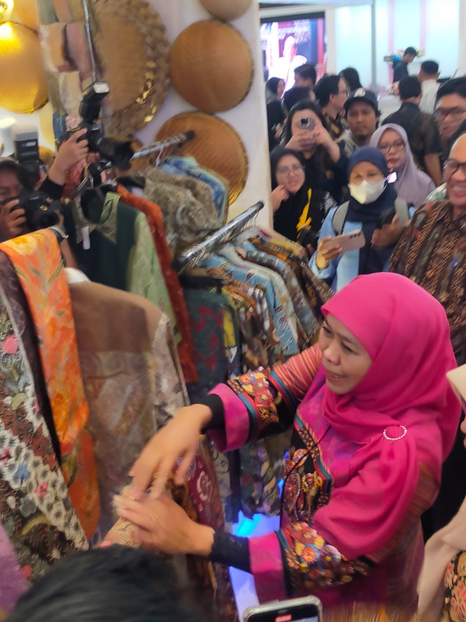 Gubernur Khofifah Indar Parawansa pada kesempatan tersebut juga mengunjungi Stand Dekranasda Kabupaten Jombang dan membeli beberapa produk batik dan sarung.