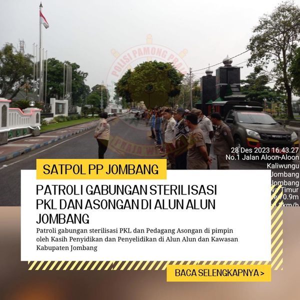 SATPOL PP PATROLI GABUNGAN DENGAN DINAS LINGKUNGAN HIDUP DAN DISHUB DALAM STERILISASI PKL dan PEDAGANG ASONGAN DI ALUN ALUN JOMBANG
