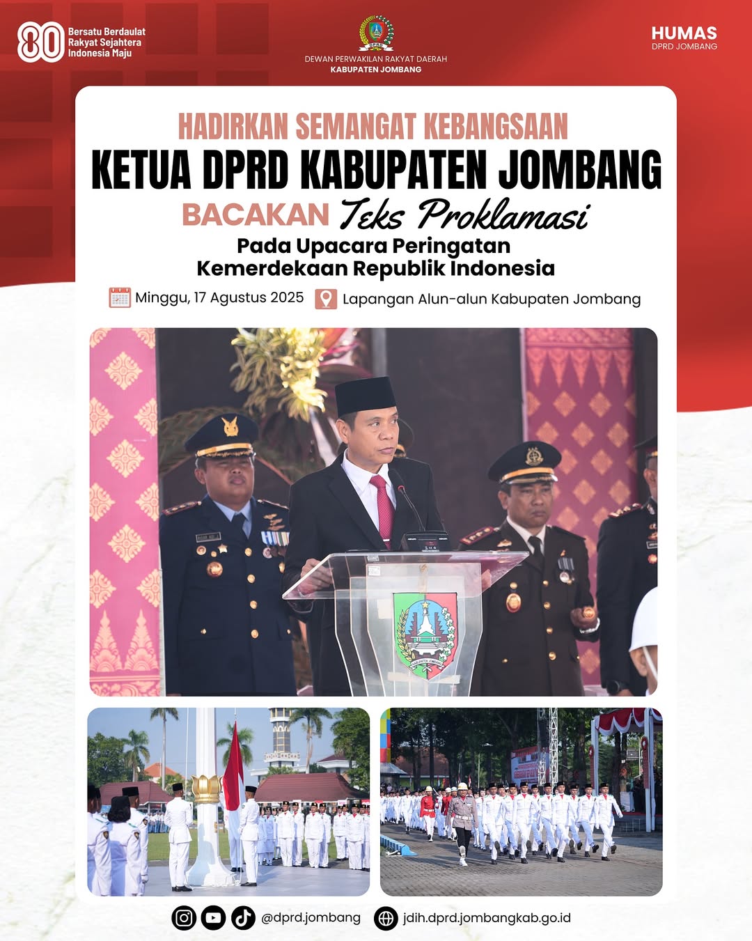 Hadirkan semangat kebangsaan Ketua DPRD Kabupaten Jombang bacakan teks proklamasi pada upacara peringatan Kemerdekaan Republik Indonesia ke 80 tahun