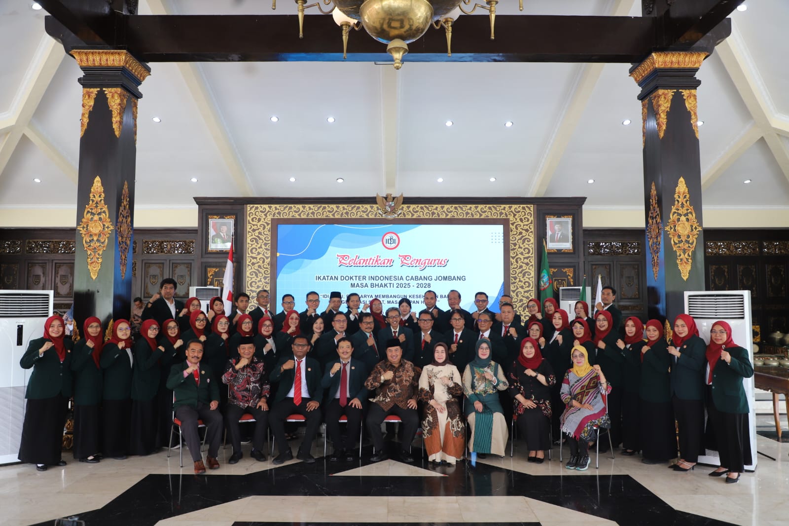 JOMBANGKAB — Ikatan Dokter Indonesia (IDI) Cabang Jombang bersama jajaran pengurus baru untuk periode 2025–2028 resmi dilantik. Pelantikan yang dipimpin oleh Ketua IDI Wilayah Jawa Timur, Dr. dr. Sutrisno, Sp.OG(K), ini berlangsung khidmat di Pendopo Kabupaten Jombang pada Sabtu (13/12/2025). dr. Hexawan Tjahja Widada, M.KP., kembali memimpin IDI Cabang Jombang bersama 49 pengurus baru lainnya.