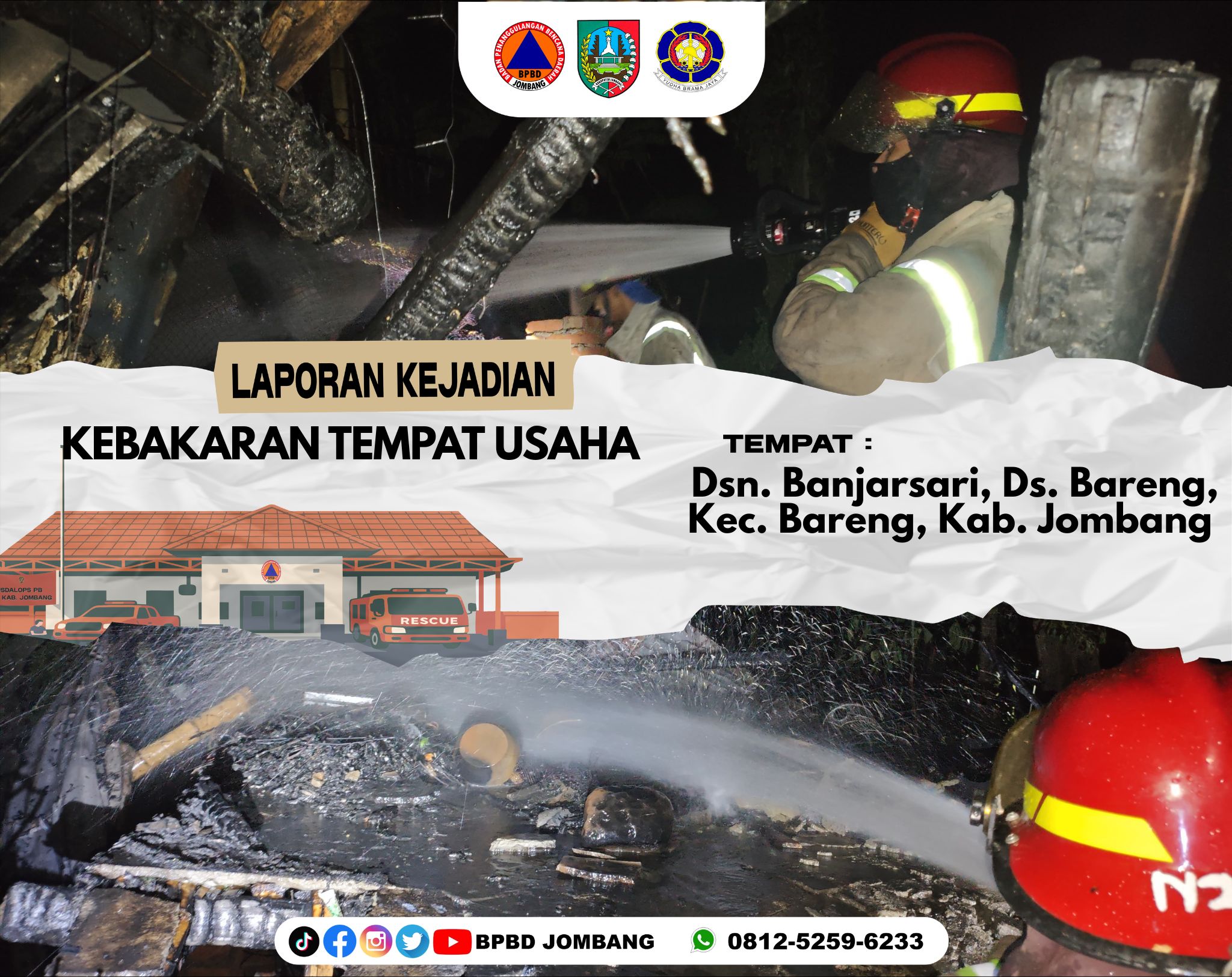 STOP KONTAK BERASAP PICU KEBAKARAN BENGKEL DI BARENG, DAMKAR JOMBANG GERAK CEPAT JINAKKAN API