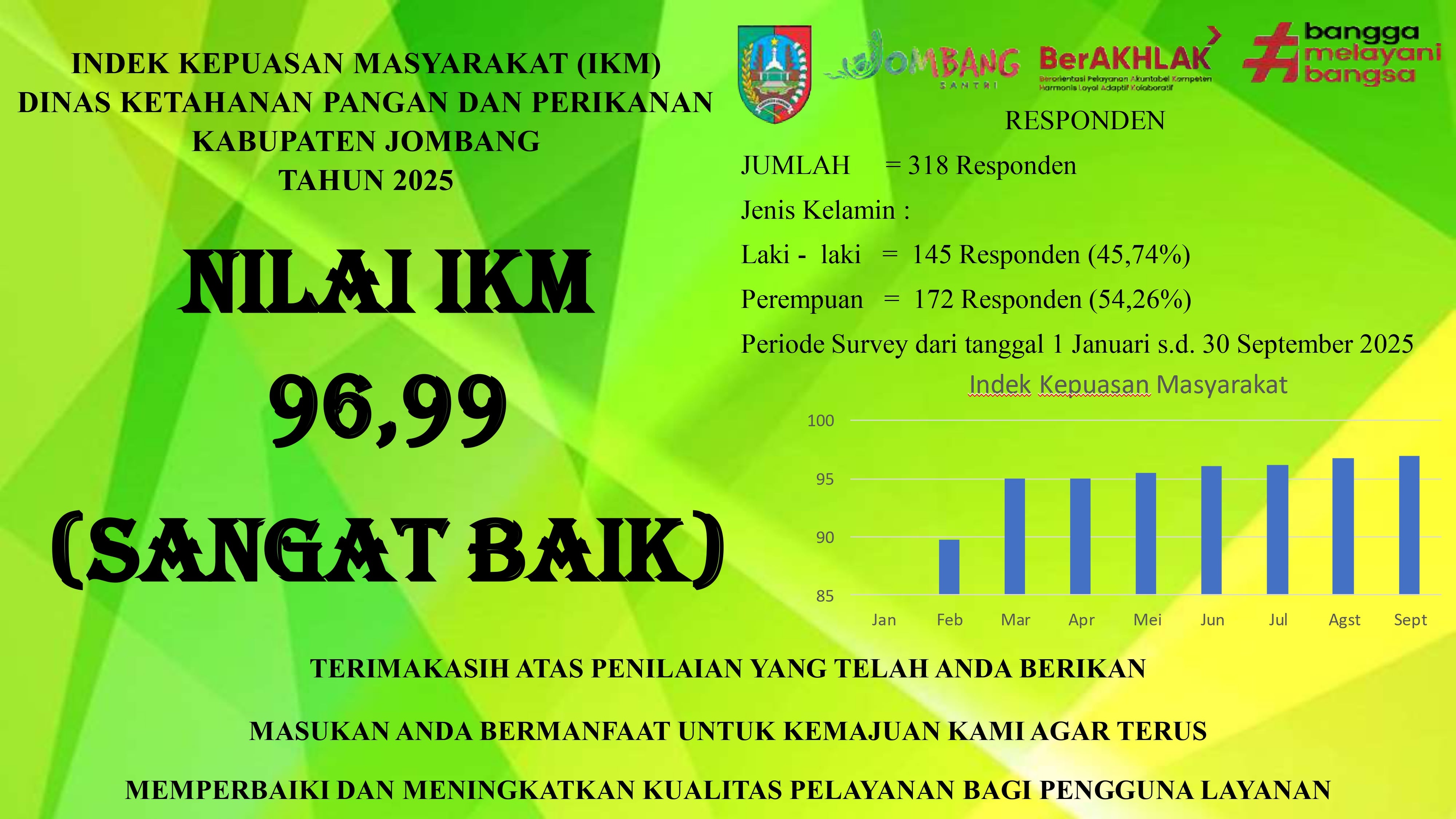 Indeks Kepuasan Masyarakat sampai dengan 30 September 2025 pada Dinas Ketahanan Pangan dan Perikanan Kabupaten Jombang