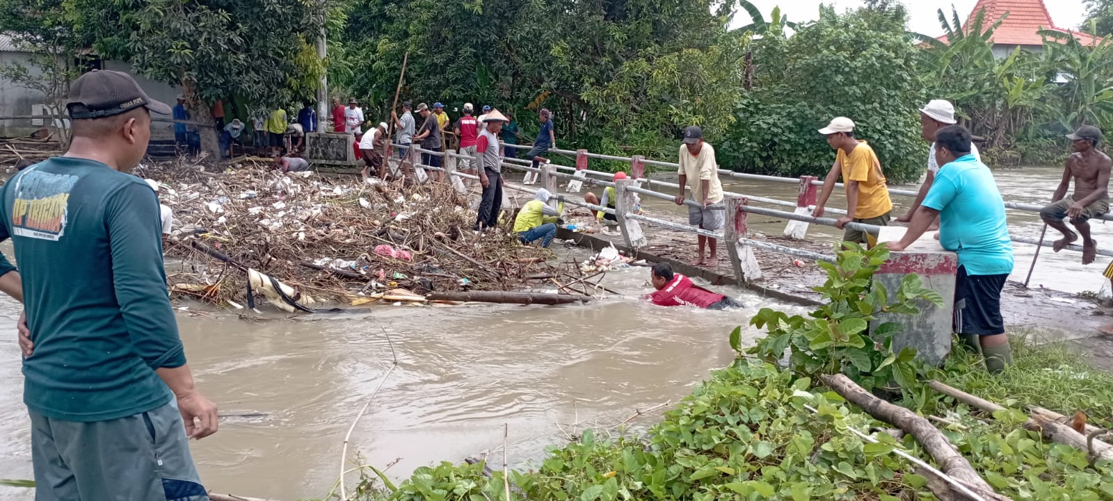 SAMPAH DAN RANTING BAMBU TERSANGKUT DI JEMBATAN KALI MARMOYO