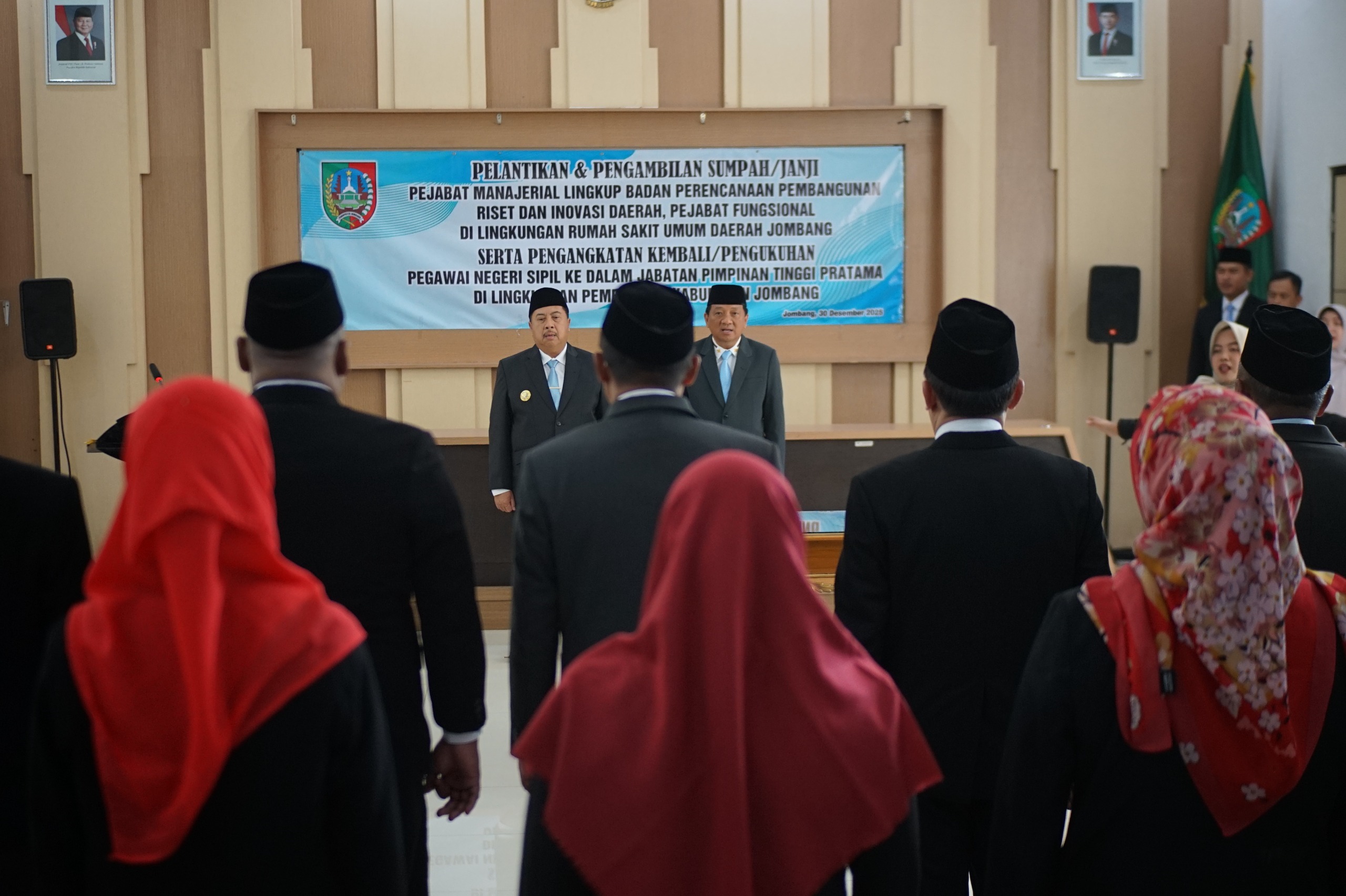 JOMBANGKAB – Pemerintah Kabupaten Jombang melalui Badan Kepegawaian dan Pengembangan Sumber Daya Manusia (BKPSDM) menggelar pelantikan dan pengambilan sumpah jabatan bagi sejumlah Aparatur Sipil Negara (ASN) di Ruang Rapat Swagata Pendopo Kabupaten Jombang, Selasa (30/12/2025) pagi.