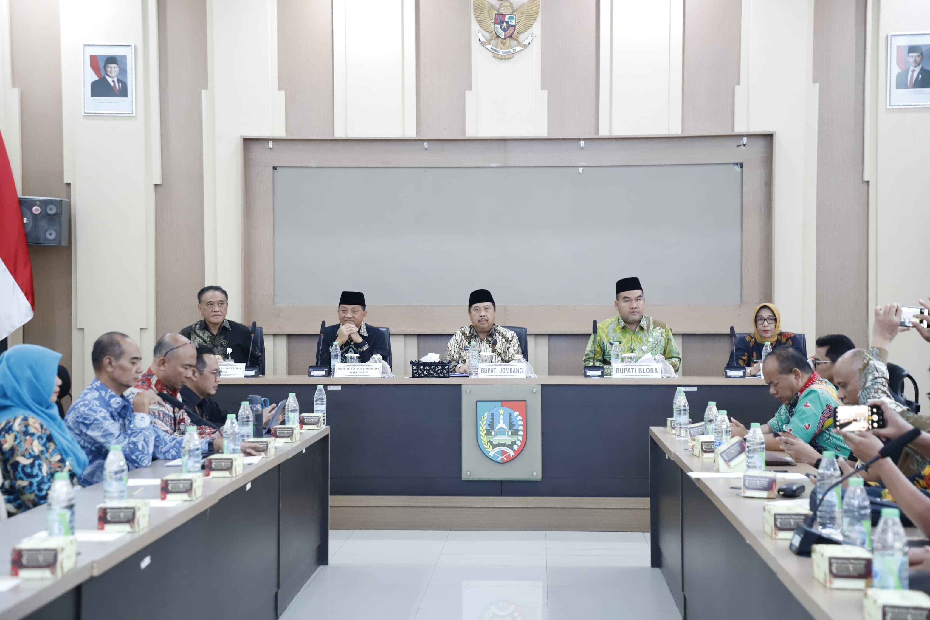 JOMBANGKAB – Pemerintah Kabupaten Blora melakukan kunjungan kerja dalam rangka studi tiru ke Pemerintah Kabupaten Jombang pada Kamis (23/4/2026). Rombongan yang dipimpin langsung oleh Bupati Blora, Dr. H. Arief Rohman, S.IP., M.Si.,dan Wakil Bupati Blora Hj. Sri Setyorini disambut hangat oleh Bupati Jombang H. Warsubi, S.H., M.Si, didampingi Agus Purnomo, S.H., M.Si. (Sekretaris Daerah), Khoirul Hasyim, S.Pd., M.Pd. (Direktur Perumdam Tirta Kencana) serta Staf Ahli, Kepala Perangkat Daerah terkait lingkup Pemkab Jombang di Ruang Rapat Swagata, Pendopo Kabupaten Jombang.