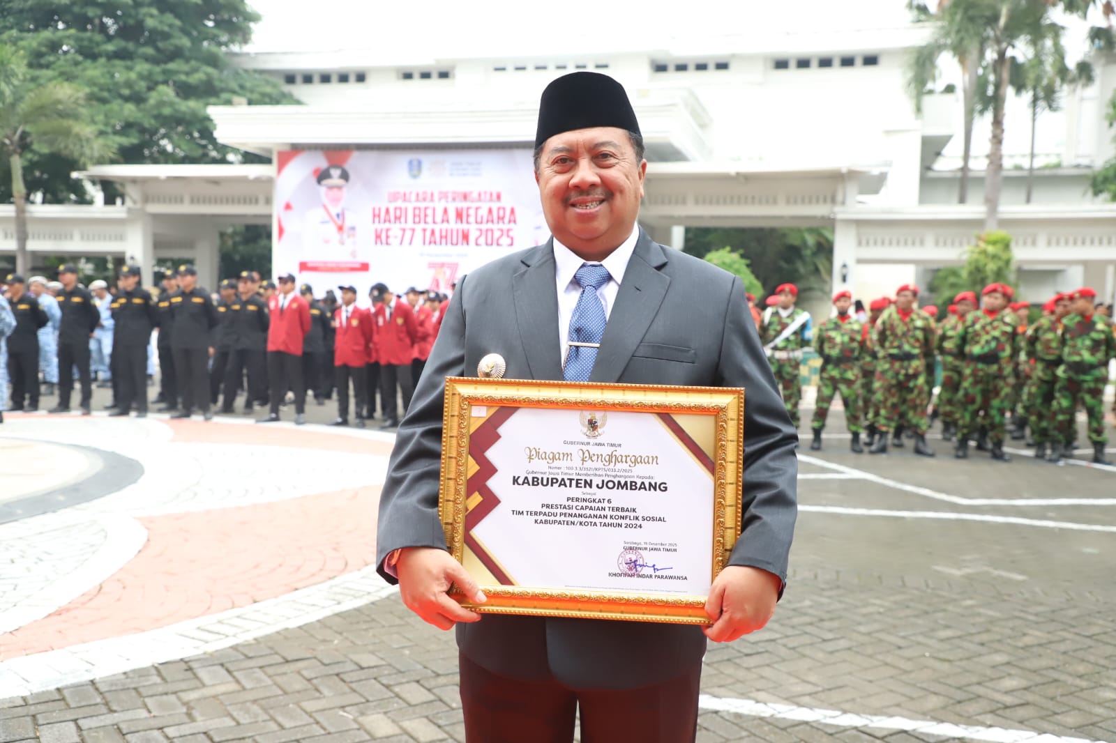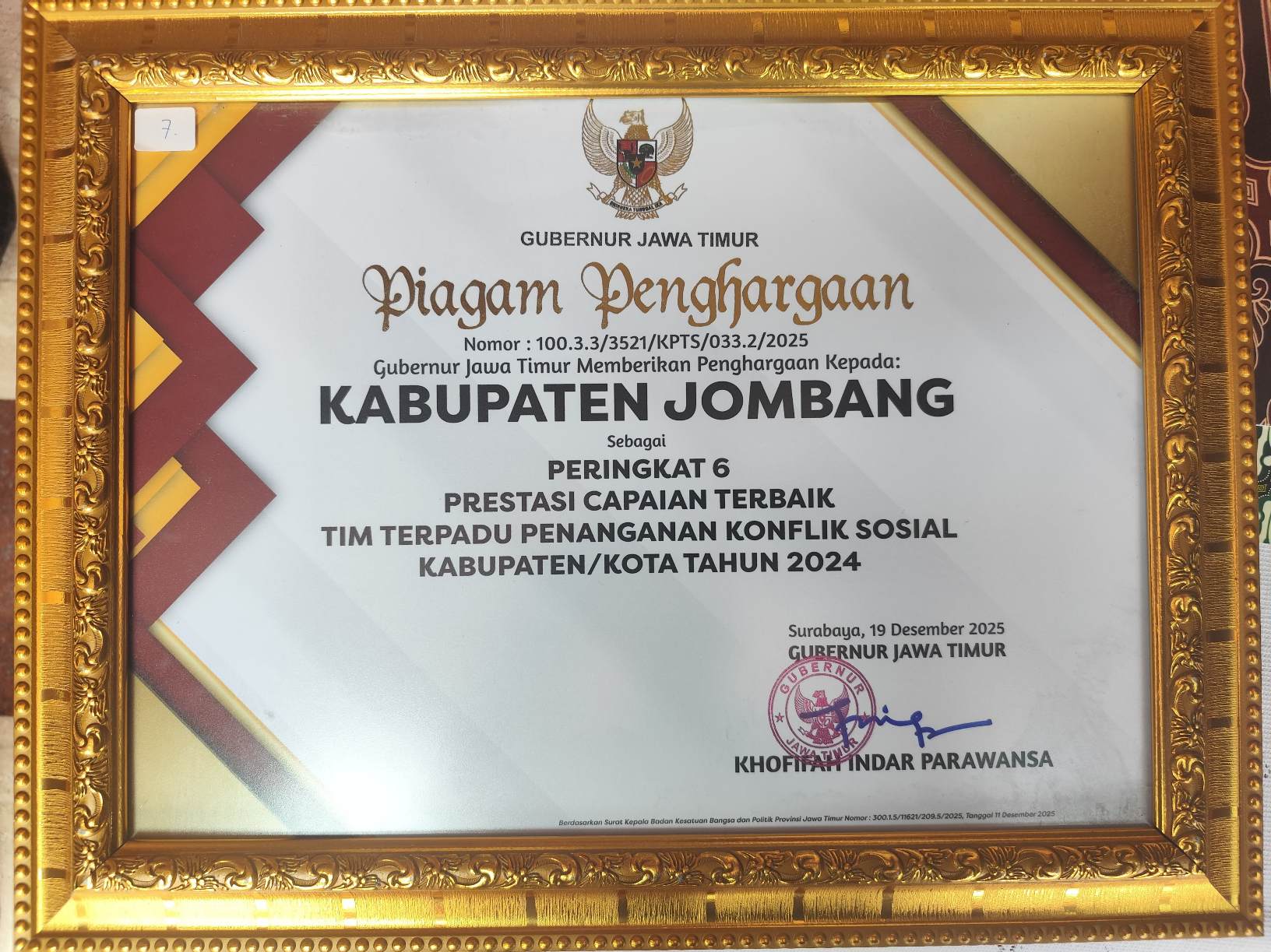 JOMBANGKAB – Pemerintah Kabupaten Jombang kembali menorehkan prestasi dalam tata kelola keamanan dan harmoni sosial. Bupati Jombang, H. Warsubi, SH, M.Si, menerima apresiasi khusus dari Gubernur Jawa Timur atas keberhasilan dalam Evaluasi Pelaporan Aksi Terpadu Penanganan Konflik Sosial. "Jombang Peringkat 6 Prestasi Capaian Terbaik Tim Terpadu Penanganan Konflik Sosial Kabupaten/Kota Tahun 2024.