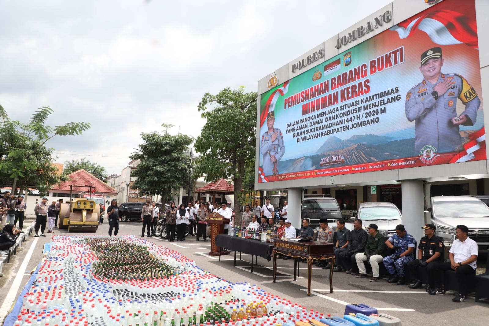 JOMBANGKAB – Pemerintah Kabupaten Jombang bersama Kepolisian Resor (Polres) Jombang melakukan pemusnahan barang bukti ribuan botol minuman keras (miras) hasil operasi cipta kondisi di Lapangan Polres Jombang, Rabu (18/2). Langkah tegas ini diambil untuk memastikan situasi Kamtibmas di wilayah Kabupaten Jombang tetap kondusif, aman, dan nyaman menjelang bulan suci Ramadan 1447 H/2026 M.