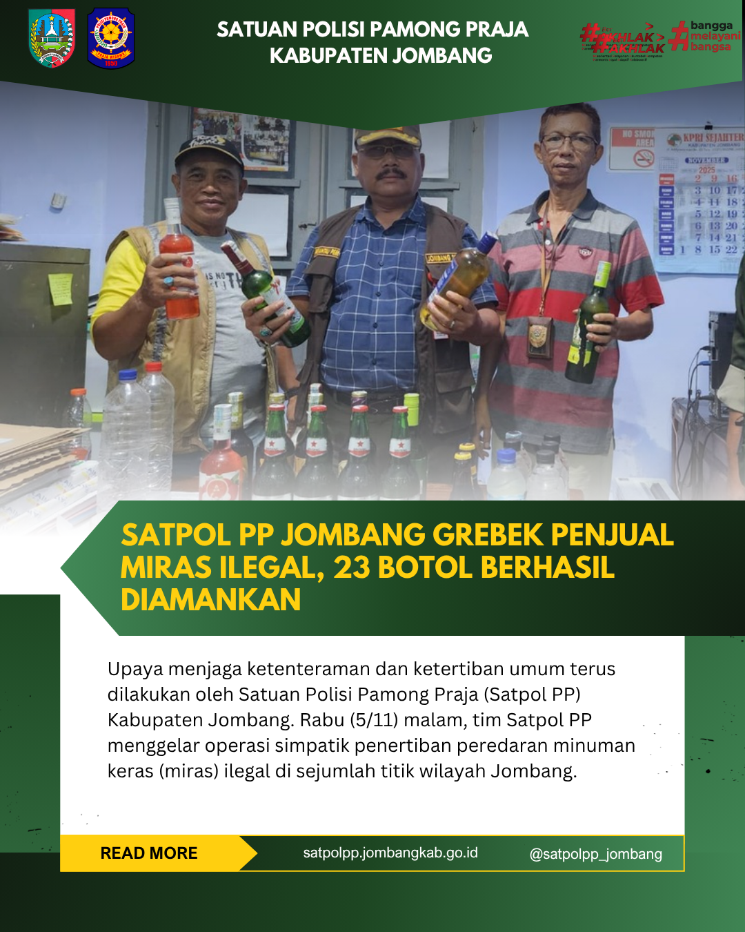 Read More Satpol PP Jombang Grebek Penjual Miras Ilegal, 23 Botol Berhasil Diamankan Satuan Polisi Pamong Praja