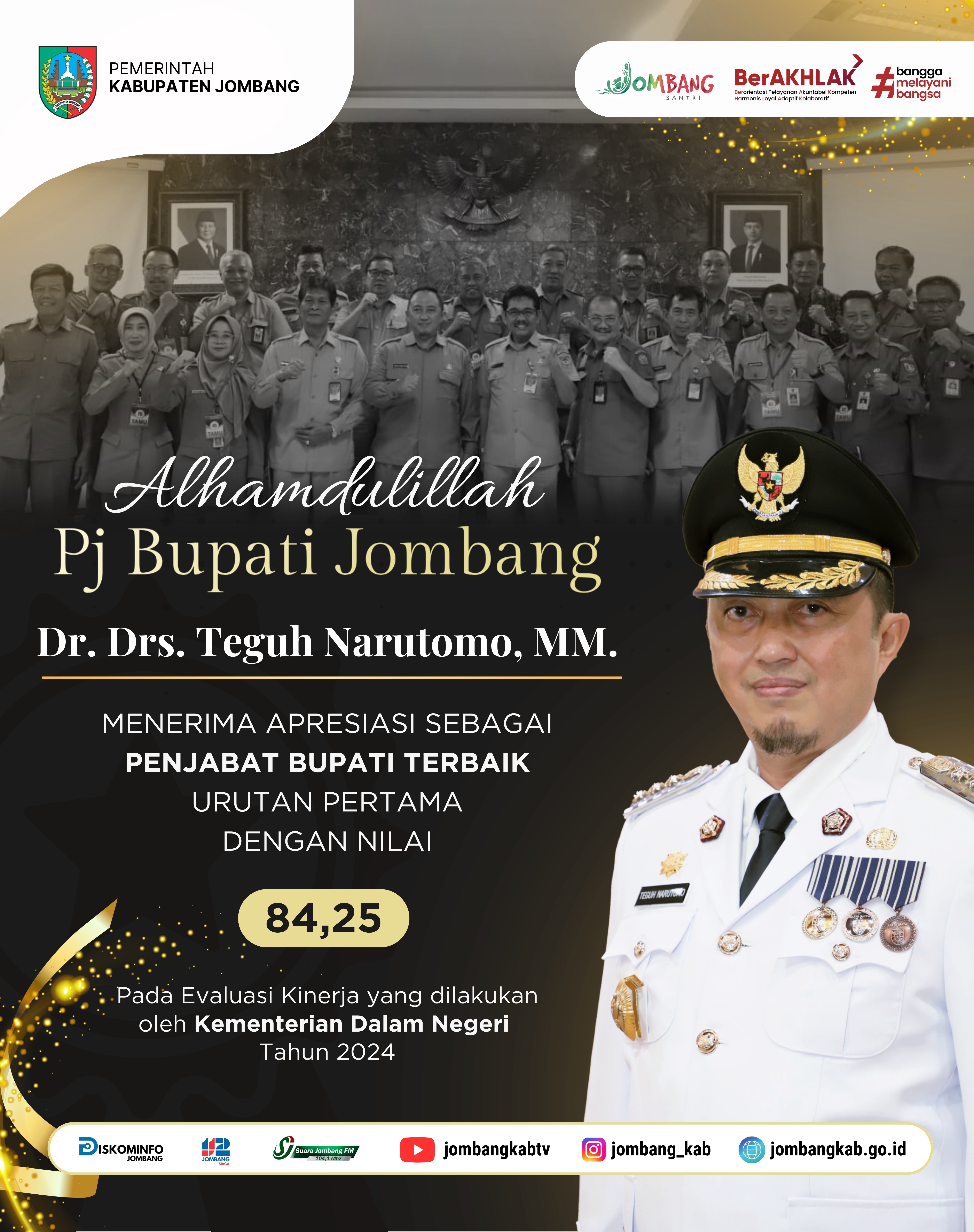 JOMBANGKAB - Penjabat Bupati Jombang, Dr. Drs. Teguh Narutomo, MM, meraih prestasi luar biasa setelah dinyatakan memperoleh capaian kinerja terbaik urutan nomor 1 se-Indonesia dengan nilai 84,25, predikat "Baik" dalam evaluasi yang dilakukan oleh Kementerian Dalam Negeri (Kemendagri).