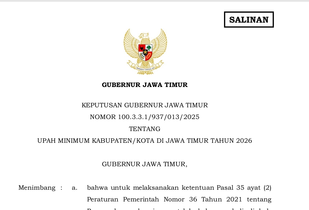 JOMBANGKAB – Pemerintah Kabupaten Jombang telah menerima Surat Keputusan Gubernur Jawa Timur Nomor: 100.3.3.1/937/013/2025 tentang Upah Minimum Kabupaten/Kota (UMK) di Jawa Timur Tahun 2026 yang ditetapkan pada 24 Desember 2025.