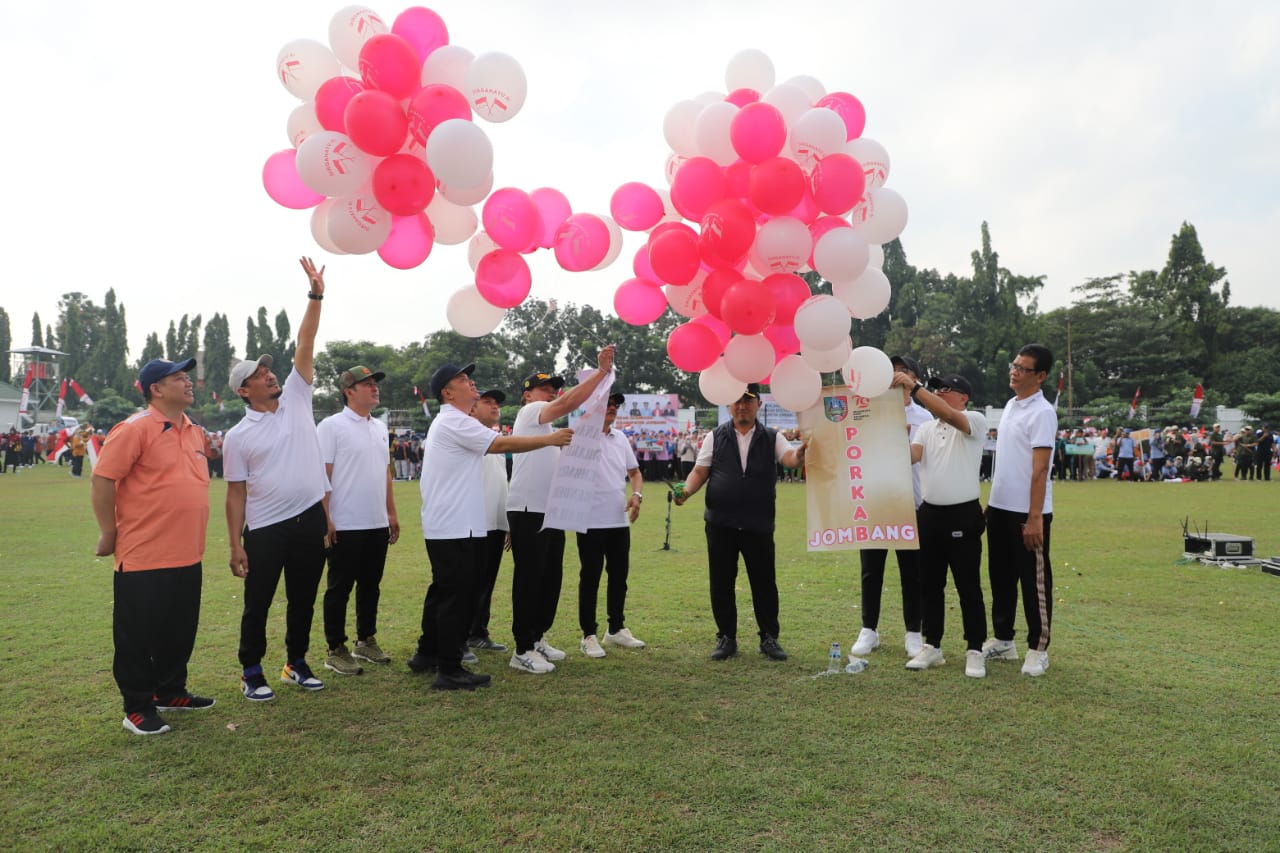 JOMBANGKAB - Meriah, rangkaian Pembukaan Pekan Olahraga (POR) Kabupaten Jombang dalam rangka memperingati HUT Ke−79 Proklamasi Kemerdekaan Republik Indonesia di lingkup pemerintah Kabupaten Jombang tahun 2024. Kegiatan tahunan yang kali ini mengusung tema "Nusantara Baru, Indonesia Maju" ini digelar di lapangan Pemkab Jombang, pada Kamis (1/8/2024) pagi.