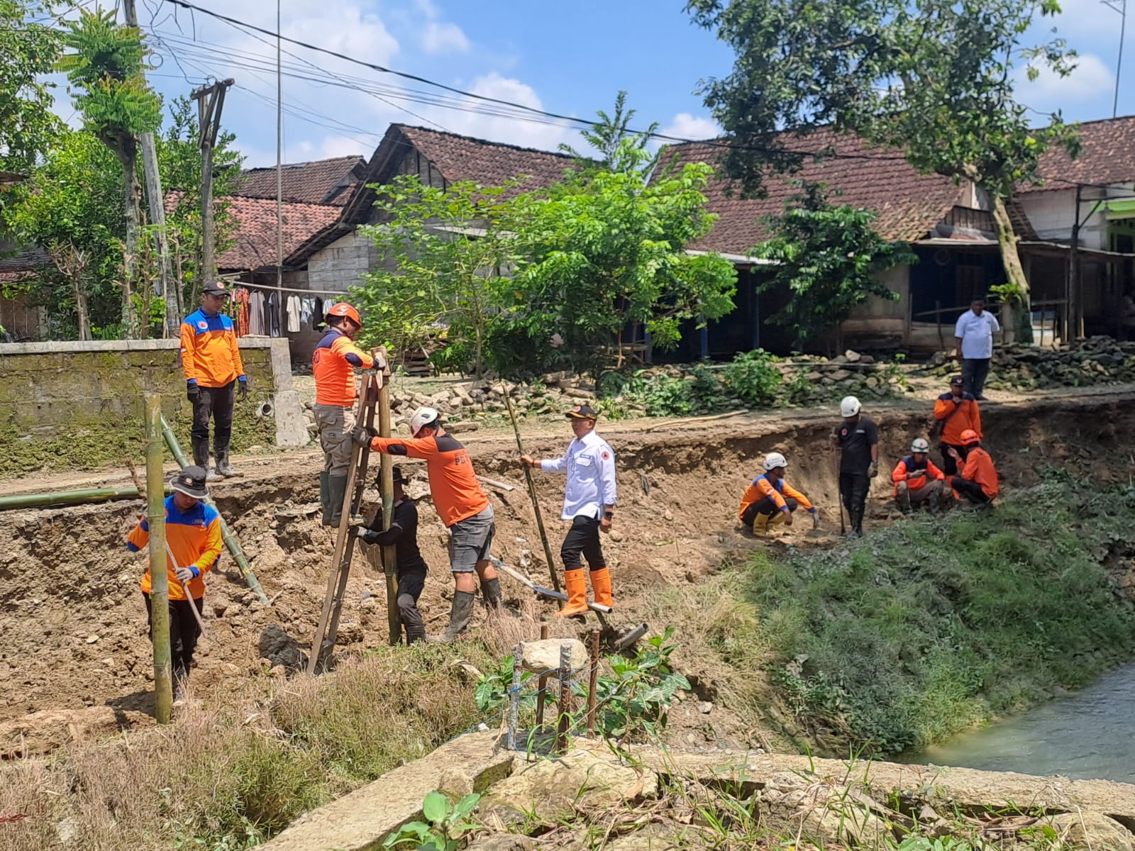 Hujan deras dengan intensitas tinggi dalam sepekan terakhir memicu peningkatan debit air sungai secara drastis. Kondisi ini menyebabkan erosi parah pada tanggul yang mulai mengancam keselamatan permukiman warga. Tak ingin tinggal diam, puluhan warga bahu-membahu bergotong royong bersama petugas teknis di lapangan untuk membendung potensi bencana yang lebih besar.