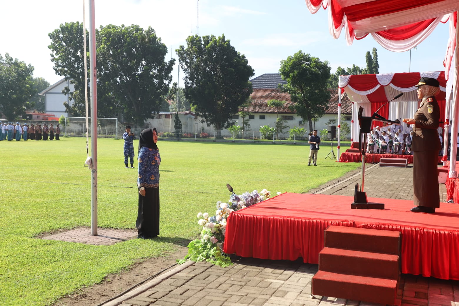 Kepala Kejaksaan Negeri Jombang, Dyah Ambarwati, S.H., M.H., selaku Inspektur Upacara dan Dra. Wor Windari, M. Si selaku Perwira Upacara. Hadir dalam jajaran tamu kehormatan, Bupati Jombang Warsubi, S.H., M.Si., Wakil Bupati Salmanudin, S.Ag., M.Pd., beserta jajaran Forkopimda Kabupaten Jombang lengkap beserta istri.
