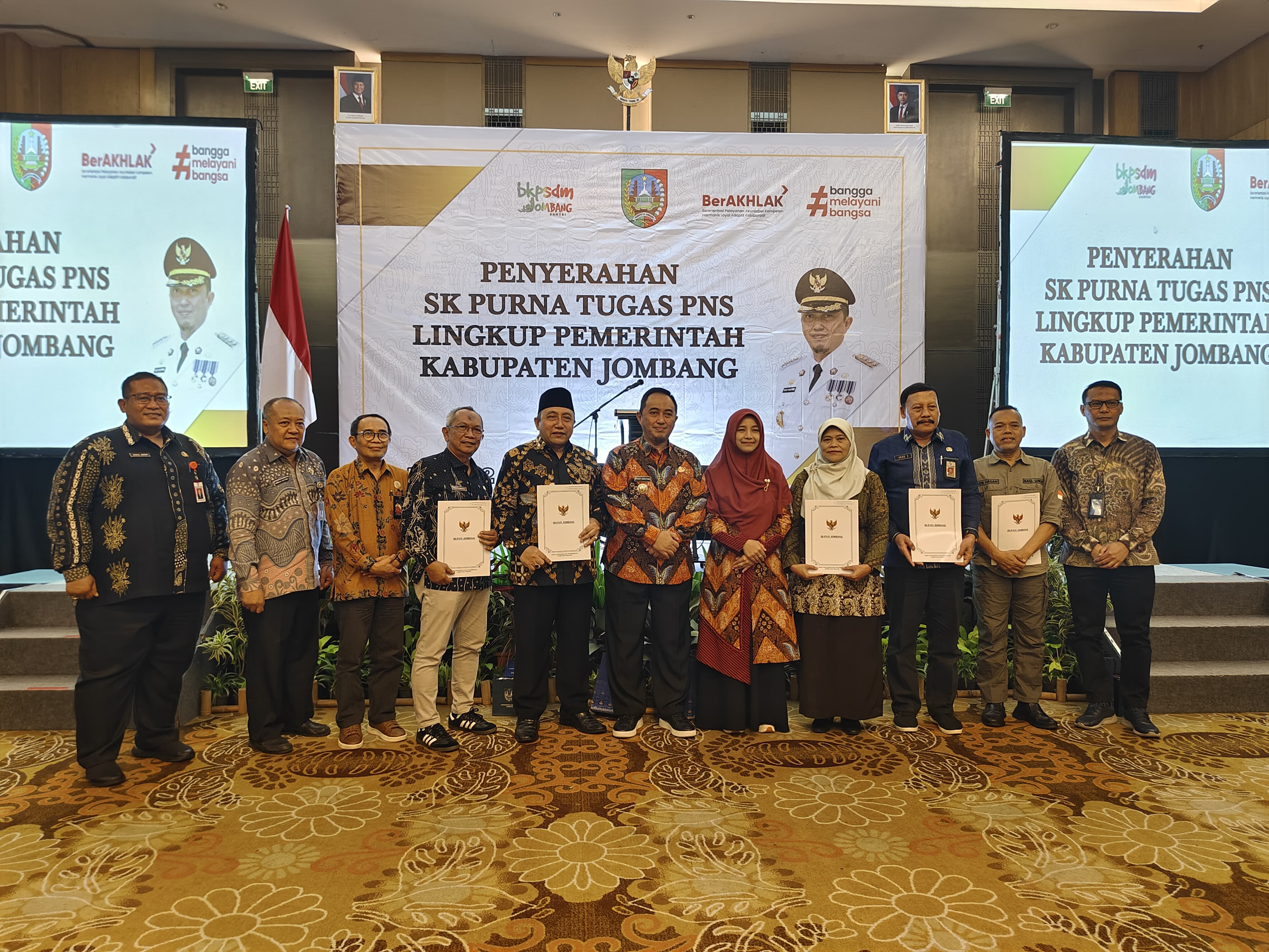 Pj Bupati Jombang menyerahkan SK Pensiun secara simbolis kepada beberapa pejabat Pemkab Jombang yang akan pensiun, diantaranya: