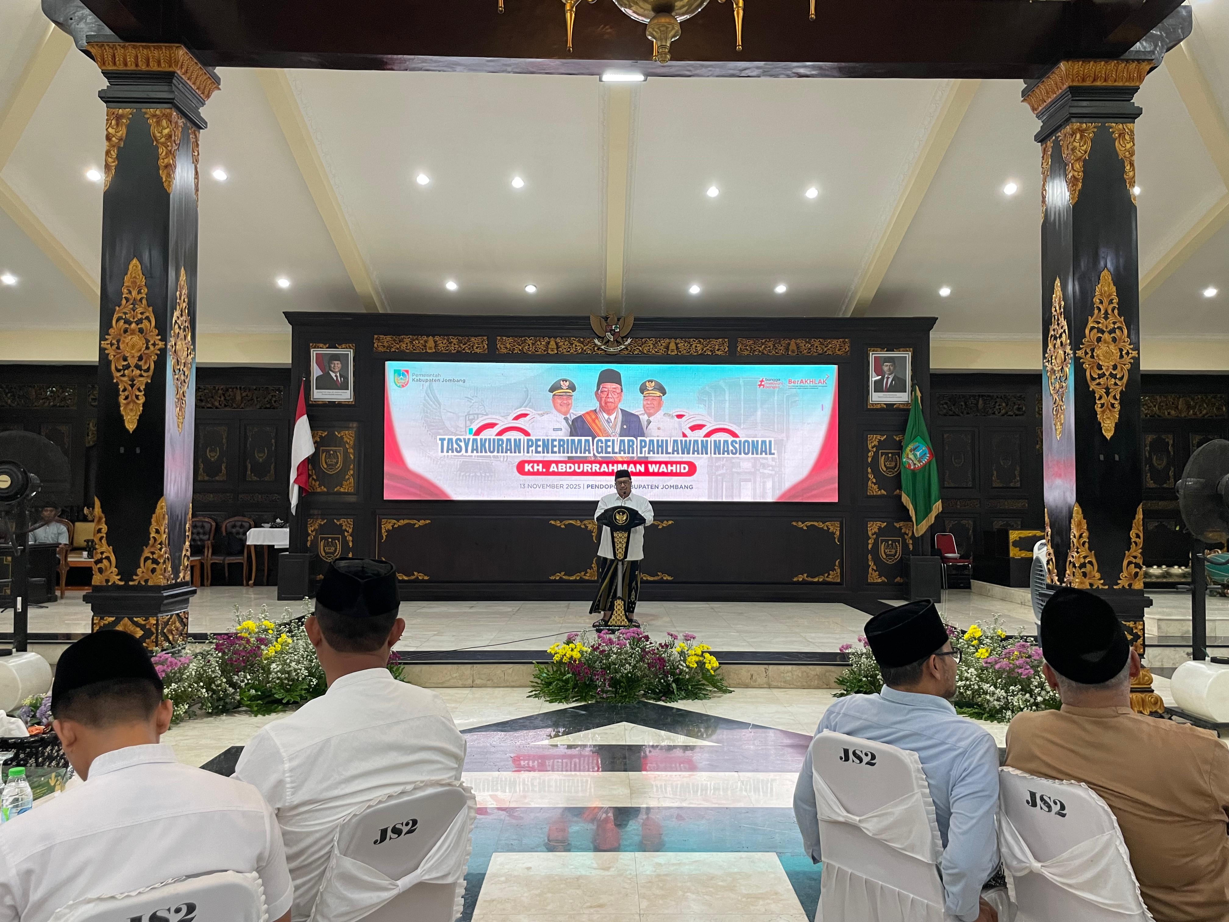 JOMBANGKAB – Suasana khidmat, haru dan bangga menyelimuti Pendopo Kabupaten Jombang pada Kamis (13/11/2025) malam, dalam acara Tasyakuran Penganugerahan Gelar Pahlawan Nasional kepada mendiang Presiden ke-4 RI, KH. Abdurrahman Wahid (Gus Dur). Acara tersebut dihadiri oleh Bupati Jombang Warsubi, Forkopimda, Sekretaris Daerah Kabupaten Jombang beserta jajaran Kepala OPD, alim ulama, tokoh agama, pimpinan pondok pesantren, dan tokoh masyarakat.