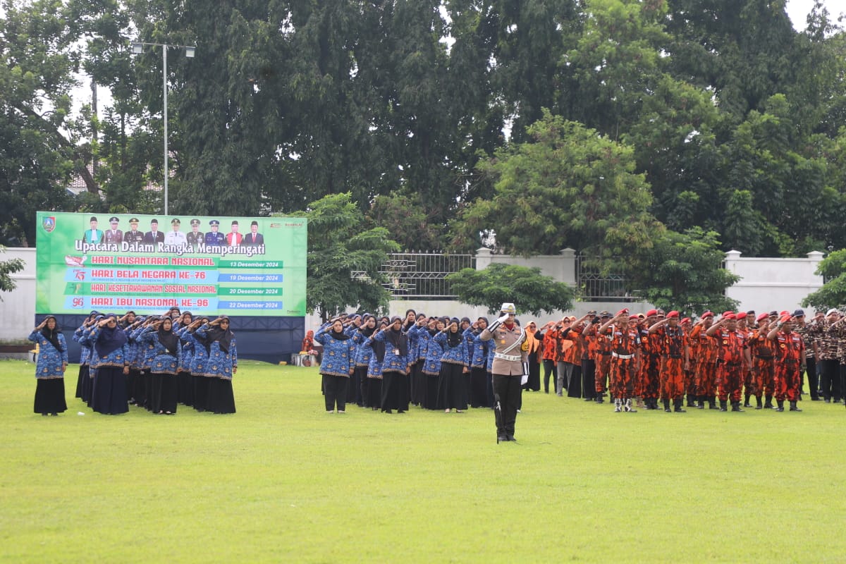JOMBANGKAB - Pemerintah Kabupaten (Pemkab) Jombang menyelenggarakan Upacara Bendera Peringatan Hari Nusantara(13 Desember), Hari Bela Negara Ke-76 (19 Desember), Hari Kesetiakawanan Sosial Nasional (20 Desember) Dan Hari Ibu Ke-96 Tahun 2024 (22 Desember) yang diperingati serempak di Lapangan Pemkab Jombang pada Senin (23/12/2024).