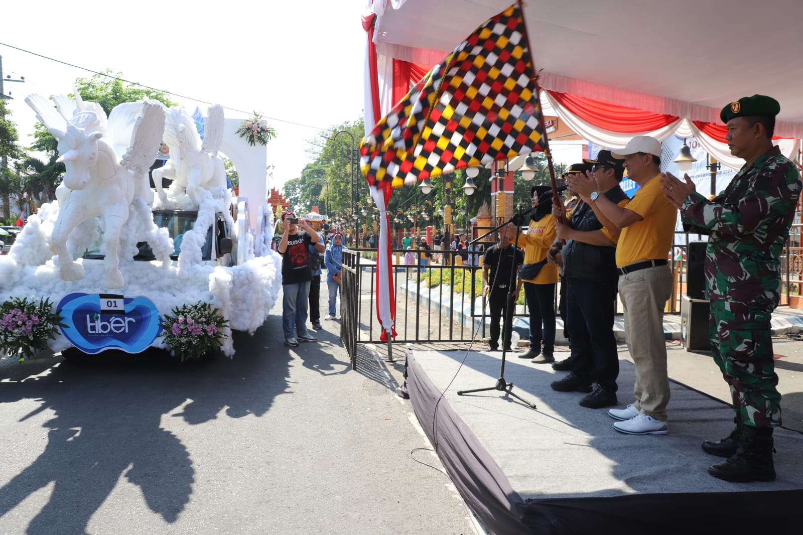 Mengendarai sepeda motor menuju ke lokasi pemberangkatan Karnaval di depan GOR Merdeka Jombang, Pj Bupati Jombang Dr. Drs.Teguh Narutomo M.M, didampingi Sekdakab Jombang Agus Purnomo S.H., M.Si, perwakilan Forkopimda dan Plh. Kepala Dinas Pendidikan Kebudayaan Kabupaten Jombang Wor Windari tepat waktu memberangkatkan para peserta Karnaval yang telah bersiap menyusuri rute yang telah ditentukan panitia.