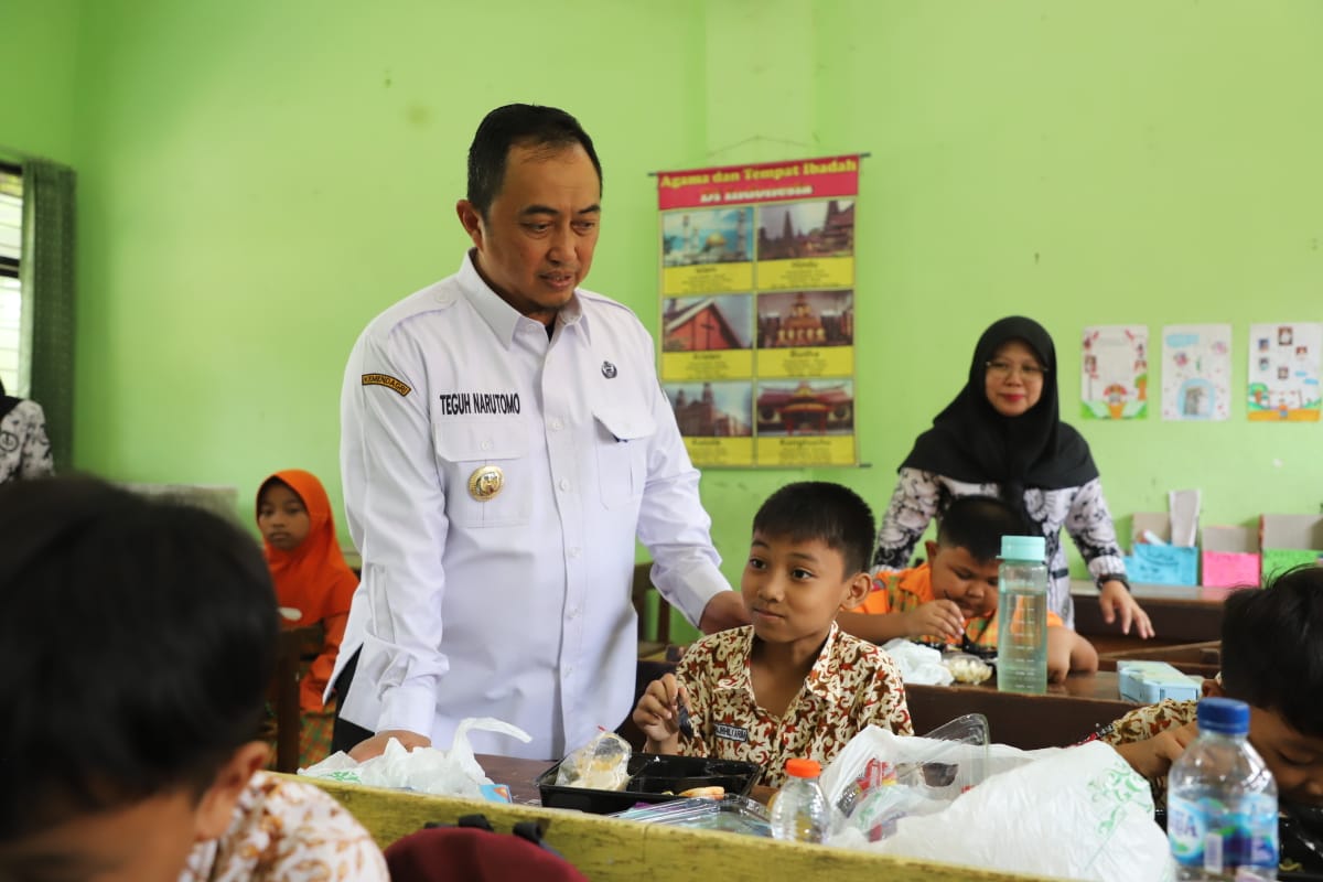 Berada diruang kelas 3 SDN Kepatihan Pj Bupati Teguh Narutomo dan Kades Kepatihan Erwin Pribadi membagikan makanan kepada para siswa dibantu oleh para guru.