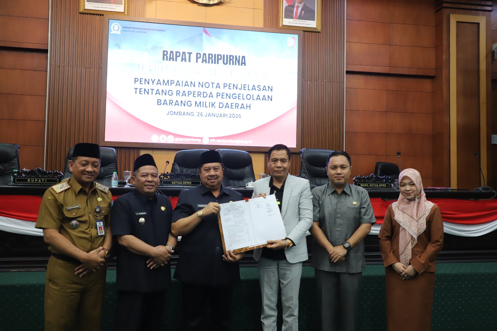 JOMBANGKAB – Pemerintah Kabupaten Jombang resmi mengajukan Rancangan Peraturan Daerah (Raperda) tentang Pengelolaan Barang Milik Daerah (BMD) dalam Rapat Paripurna Dewan Perwakilan Rakyat Daerah (DPRD) Kabupaten Jombang, Senin (26/1/2026) pagi, dengan agenda Penyampaian Nota Penjelasan tentang Raperda Pengelolaan Barang Milik Daerah, dan Penetapan Perubahan Propemperda Tahun 2026 di Ruang Rapat DPRD Kabupaten Jombang.