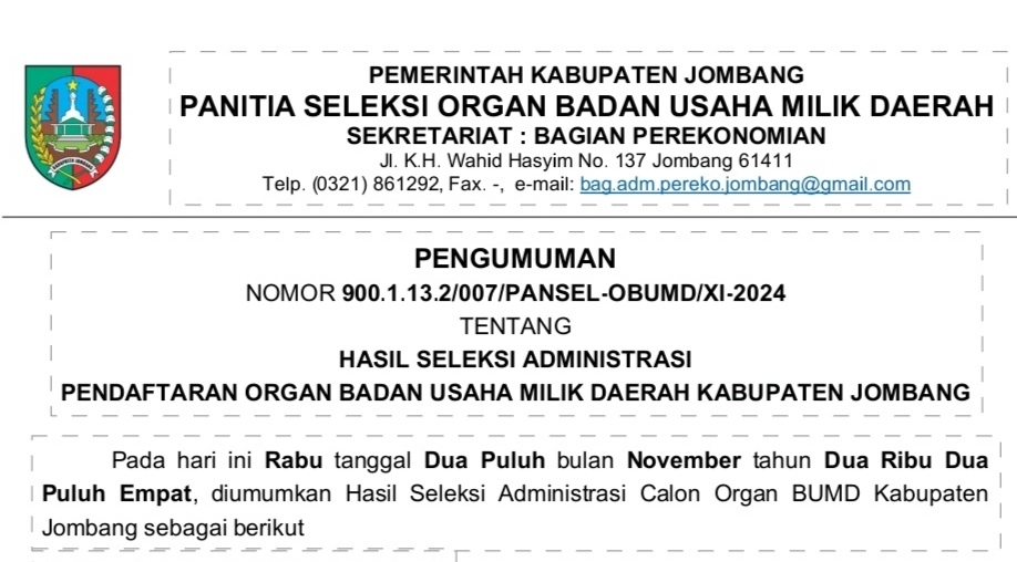 Hasil Seleksi Administrasi Pendaftaran Organ Badan Usaha Milik Daerah Kabupaten Jombang 2024