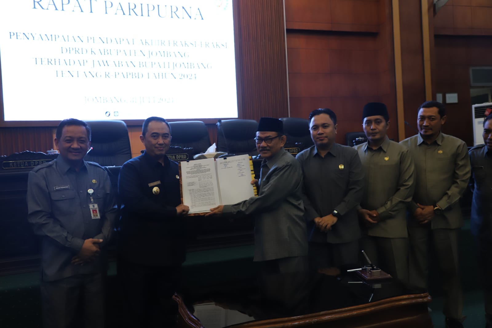 JOMBANGKAB - Seluruh Fraksi menerima dan menyetujui Rancangan Peraturan Daerah (Ranperda) Anggaran Pendapatan dan Belanja Daerah (APBD) Perubahan Tahun Anggaran 2024 untuk disahkan menjadi Peraturan Daerah (Perda). Penetapan tersebut dilaksanakan melalui rapat Paripurna DPRD Kabupaten Jombang dengan agenda Rapat Paripurna Penyampaian Pendapat Akhir Umum Fraksi DPRD Kabupaten Jombang Terhadap Jawaban Bupati Jombang tentang R- PAPBD tahun 2024 pada Rabu (31/7) siang, di Gedung DPRD Kabupaten Jombang.