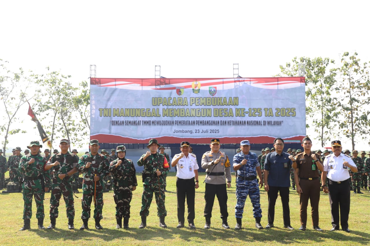 JOMBANGKAB – Pemerintah Kabupaten (Pemkab) Jombang bersama TNI resmi membuka program TNI Manunggal Membangun Desa (TMMD) ke-125 Tahun Anggaran 2025 di Lapangan Desa Manunggal, Kecamatan Ngusikan pada Rabu (23/07/2025). Bertindak sebagai pembina upacara, Sekretaris Daerah Kabupaten Jombang Agus Purnomo, S.H., M.Si., hadir mewakili Bupati Jombang Warsubi, S.H., M.Si., dan membacakan sambutan resmi bupati.