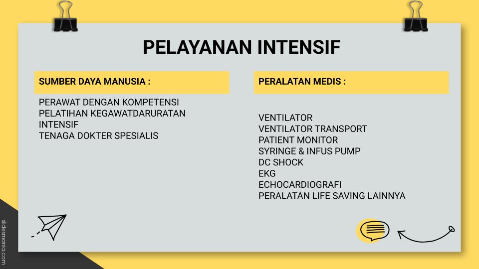 Pelayanan Intensif Care Sekunder meliputi : 1. Resusitasi Jantung Paru 2. Pengelolaan jalan nafas, termasuk intubasi trakeal dan ventilasi mekanik 3. Terapi oksigen 4. Pemasangan kateter vena sentral dan arteri 5. Pelaksanaan terapi secara titrasi 6. Pemantauan EKG, pulse oksimetri , tekanan darah non invasive dan invasive 7. Pemberian tunjangan fungsi vital dengan alat portable selama transportasi pasien gawat. 8. Melakukan prosedur isolasi