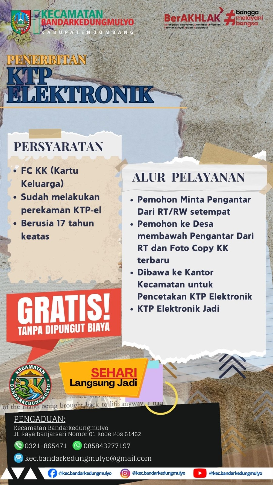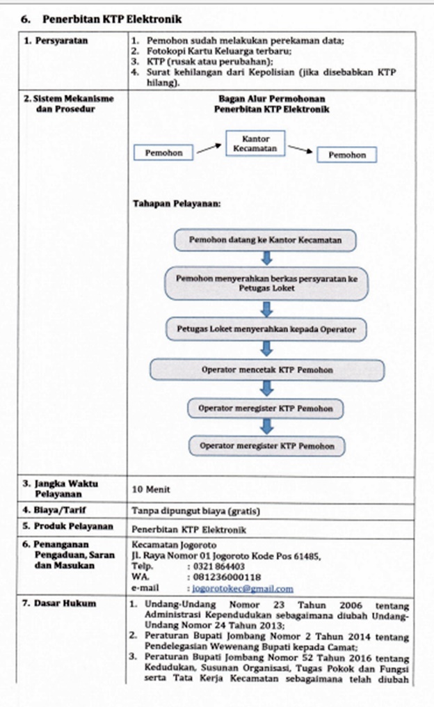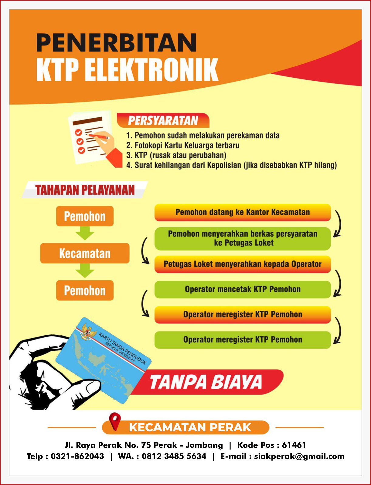 Persyaratan : 1. Pemohon sudah melakukan perekaman data; 2. Fotokopi Kartu Keluarga terbaru; 3. KTP (rusak atau perubahan); 4. Surat kehilangan dari Kepolisian (jika disebabkan KTP hilang). Gratis. Kecamatan Jogoroto Jl. Raya Nomor 01 Jogoroto Kode Pos 61485 Telp. : 0321 864403 WA. : 081236000118 e-mail : jogorotokec@gmail.com