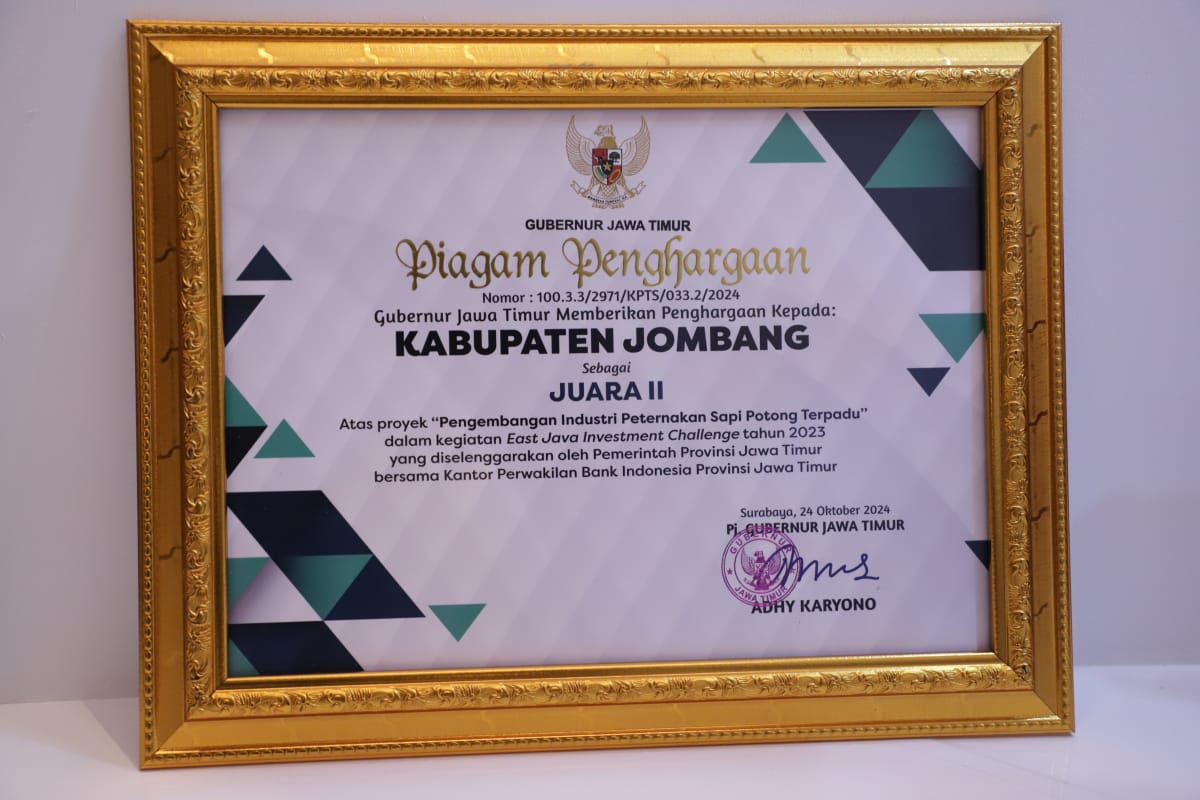 Pemerintah Kabupaten Jombang berhasil meraih Juara II dalam ajang East Java Investment Challenge Tahun 2023 yang digelar oleh Pemerintah Provinsi Jawa Timur bekerja sama dengan Bank Indonesia Perwakilan Jawa Timur.