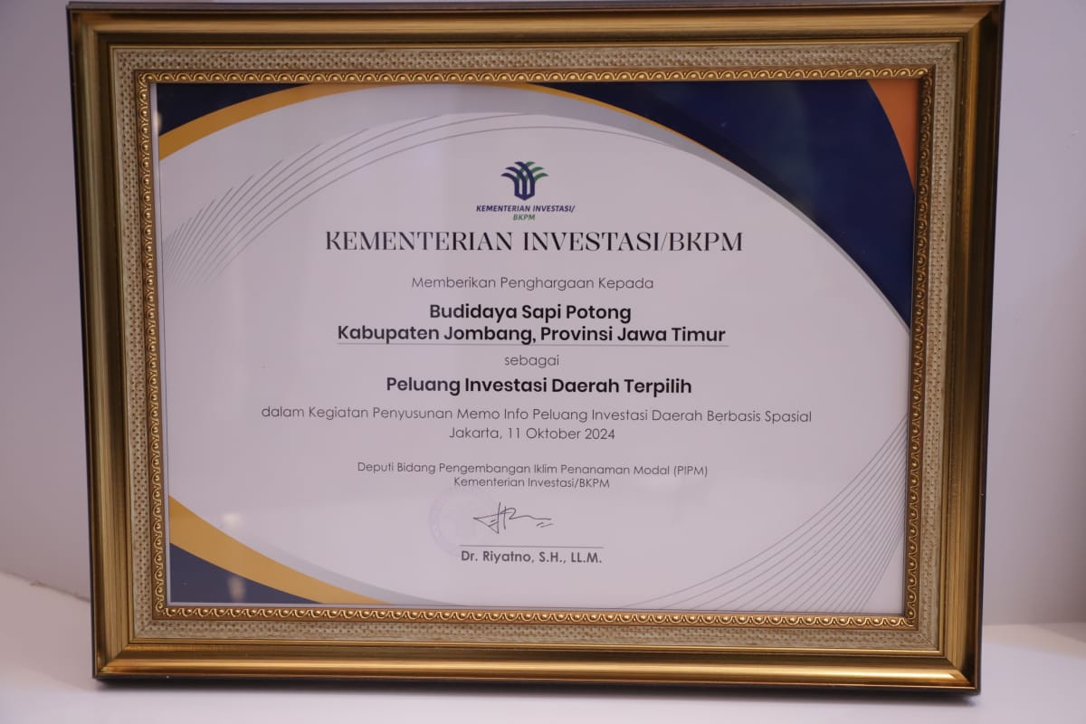Jombang juga mendapat penghargaan dari Kementrian Investasi/BKPM sebagai peluang investasi daerag terpilih dalam kegiatan penyusunan memo info peluang investasi daerah berbasis spasial