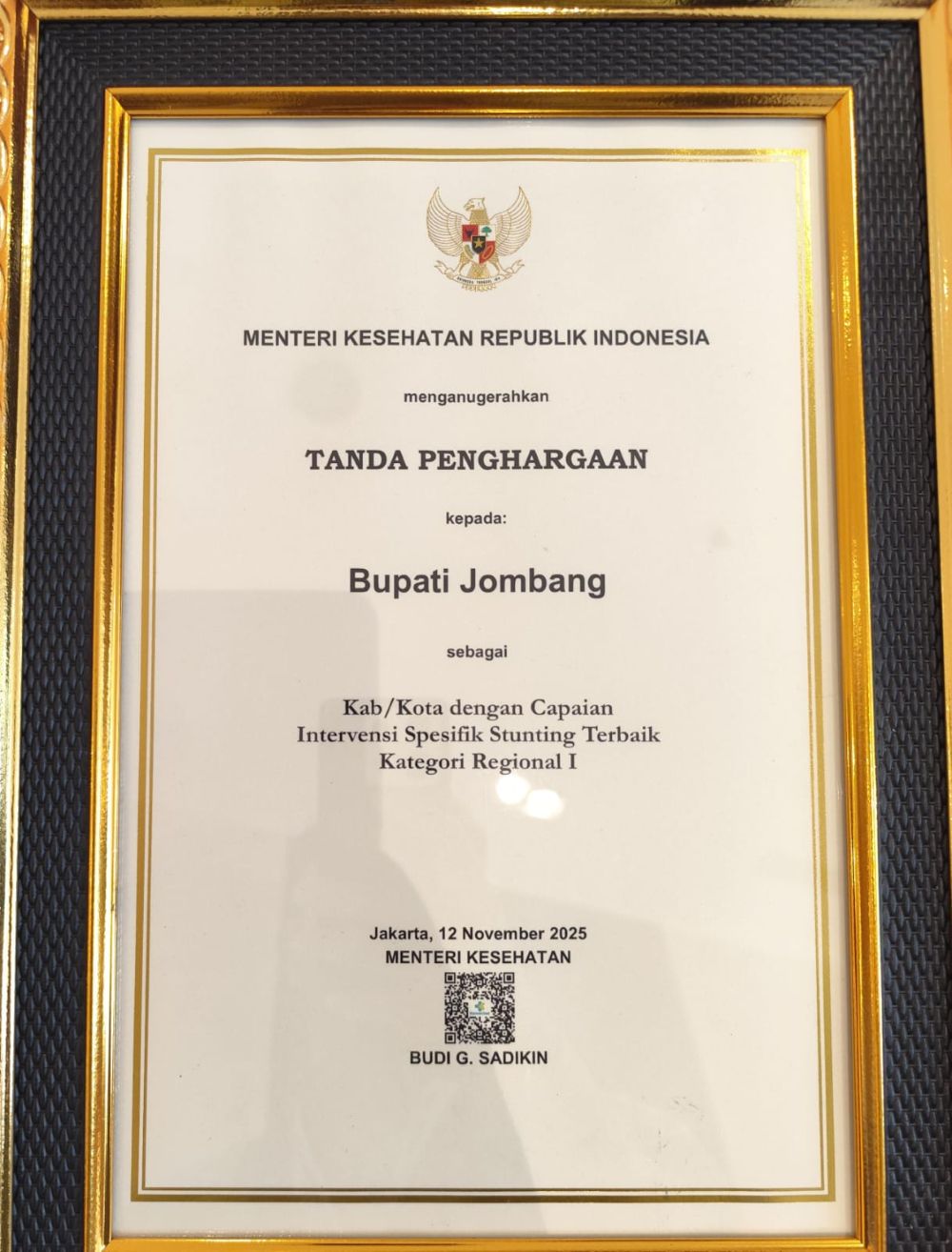 Penghargaan ini diserahkan oleh Menteri Kesehatan RI Budi G. Sadikin kepada Bupati Jombang Warsubi pada acara Rapat Koordinasi Nasional Percepatan Penurunan Stunting Tahun 2025 (Rakornas PPS 2025) yang berlangsung pada Rabu, 12 November 2025, di Ruang Leimena, Lantai 2 Gedung Adhyatma, Kementerian Kesehatan, Jakarta Selatan.